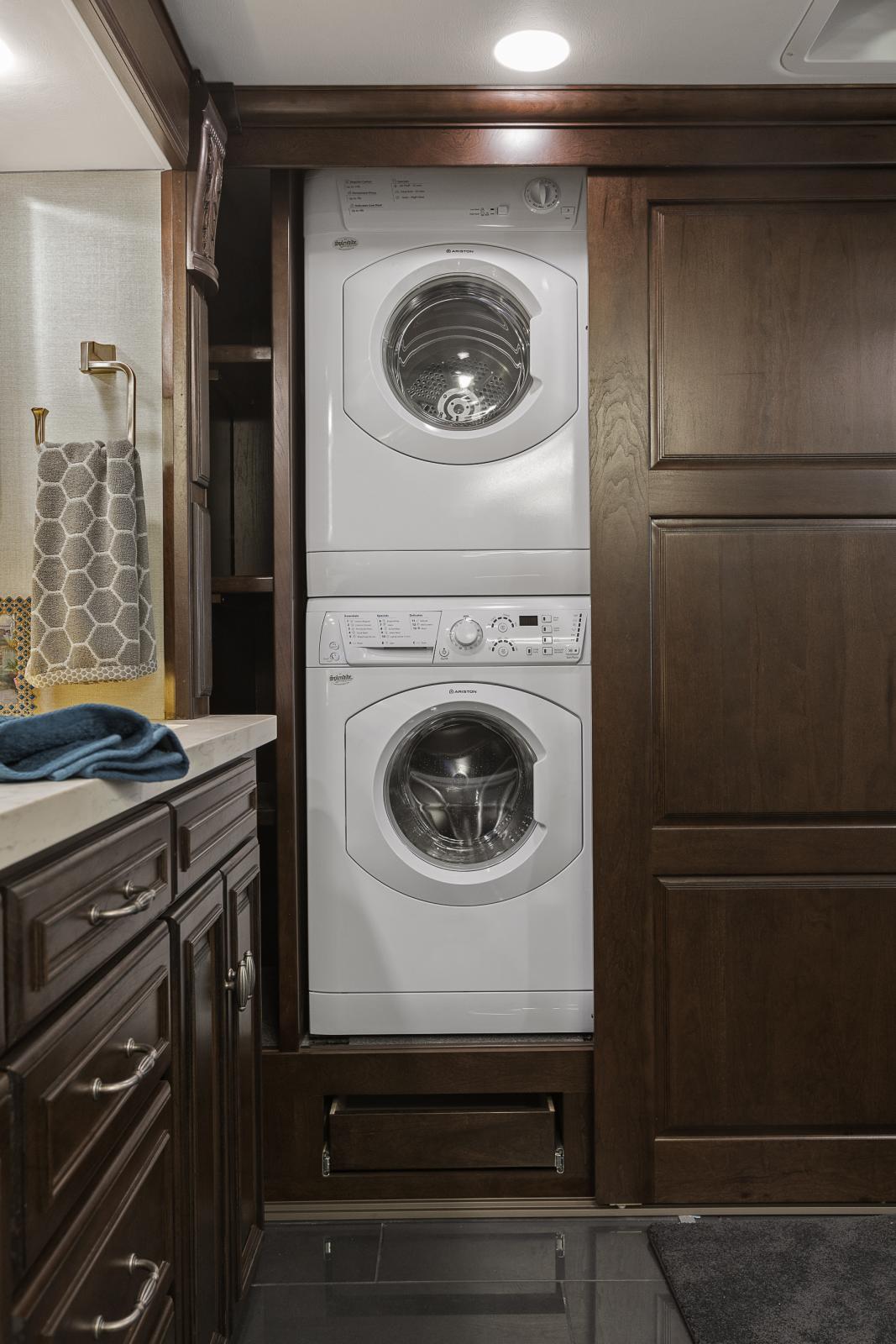 Badrummet, bakom luckorna finns garderober samt tvättpelare med tvättmaskin/tumlare. Även här finns en tv så att man inte missar nyheterna sittande på dass.