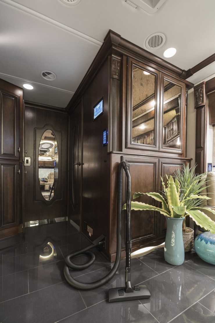 Centraldammsugare. Bakom väggen vid dammsugaren finns gästtoaletten, därmed behöver man inte klampa genom värdparets sovrum för att gå på dass. Dörren med spegel går till "master bedroom".