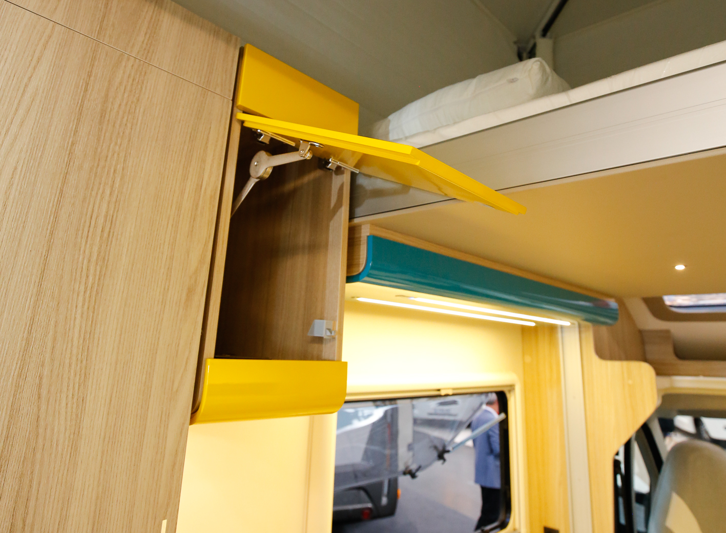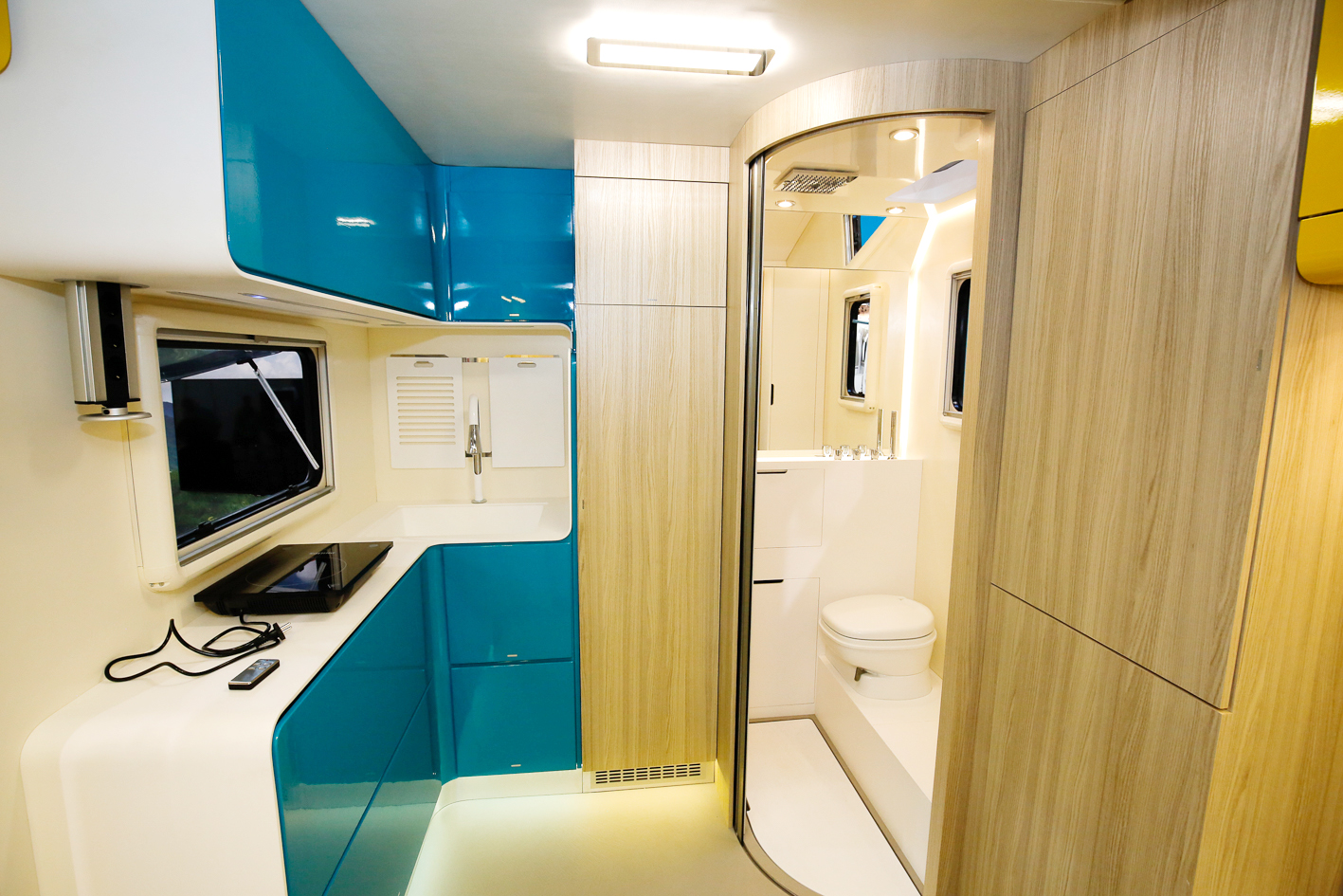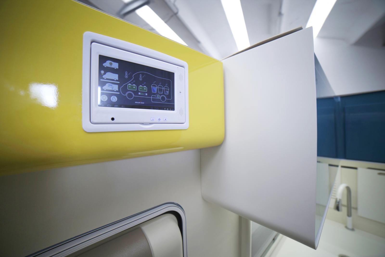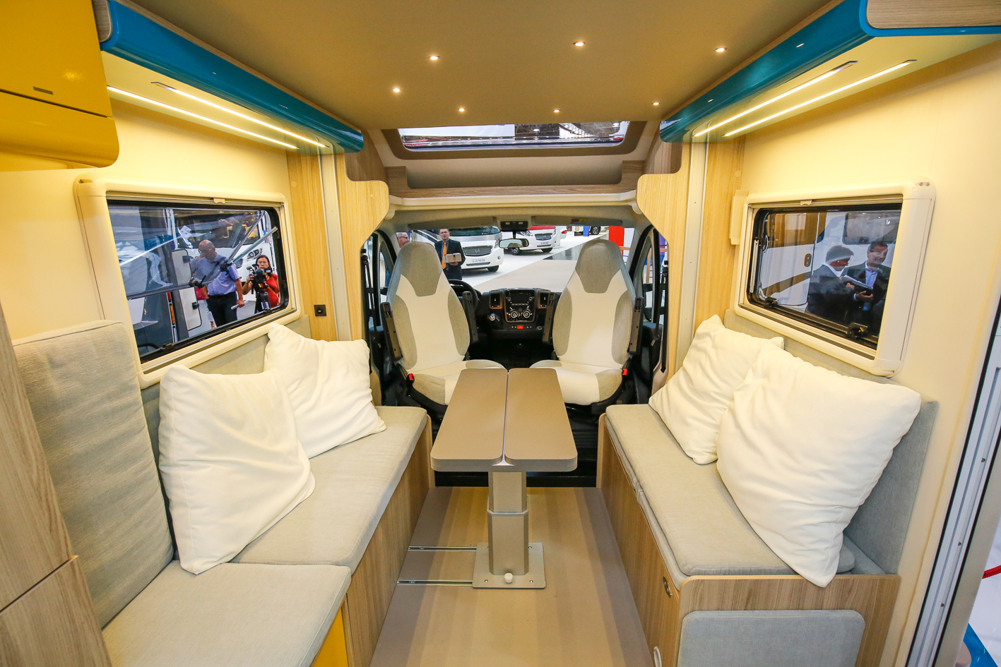 Den främre delen av bilen består av modulmöbler. Matbordet är flexibelt det med.