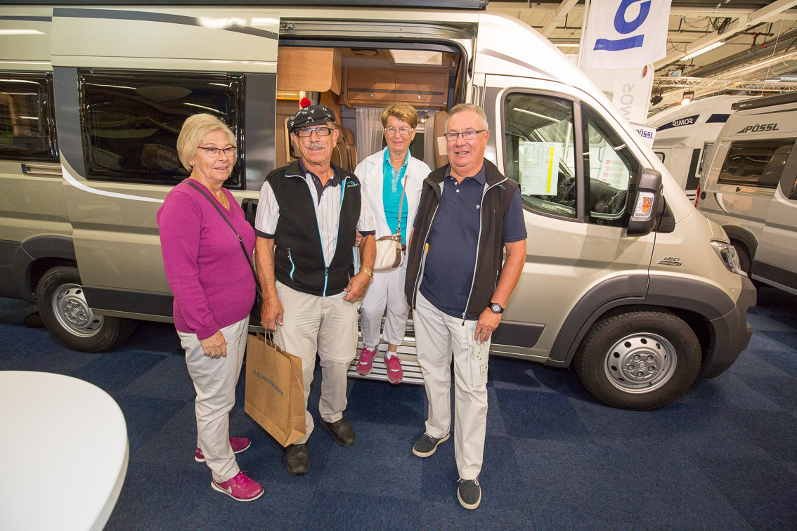 Här är ett glatt gäng som kikar på plåtisar. Lastrada eller Pössl är frågan när de är i Husbilar i Pukaviks monter.