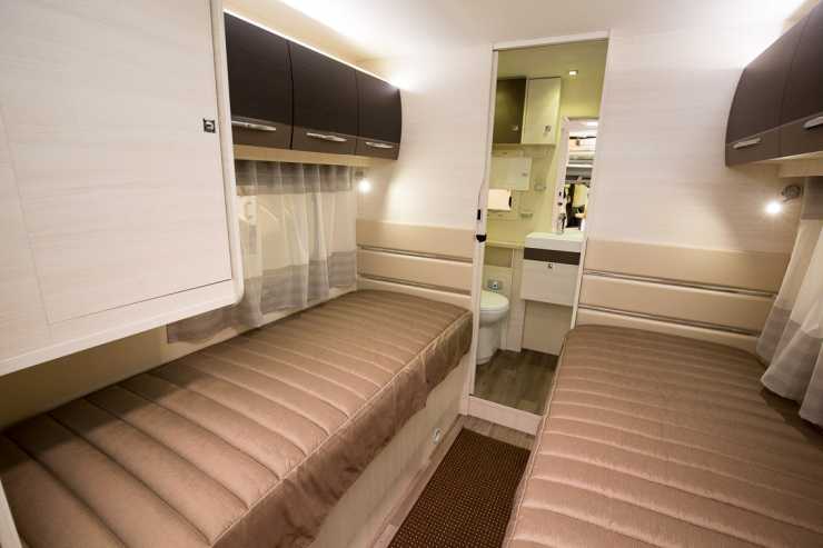 SL 712 har låga långbäddar och badrummet längst bak. En väldigt populär planlösning.