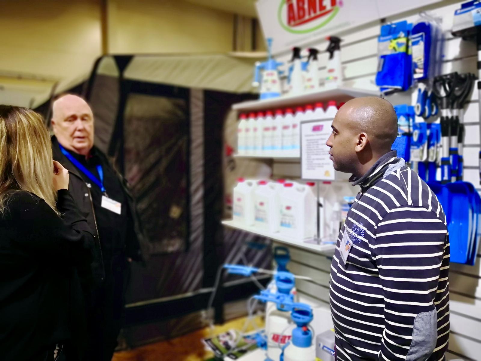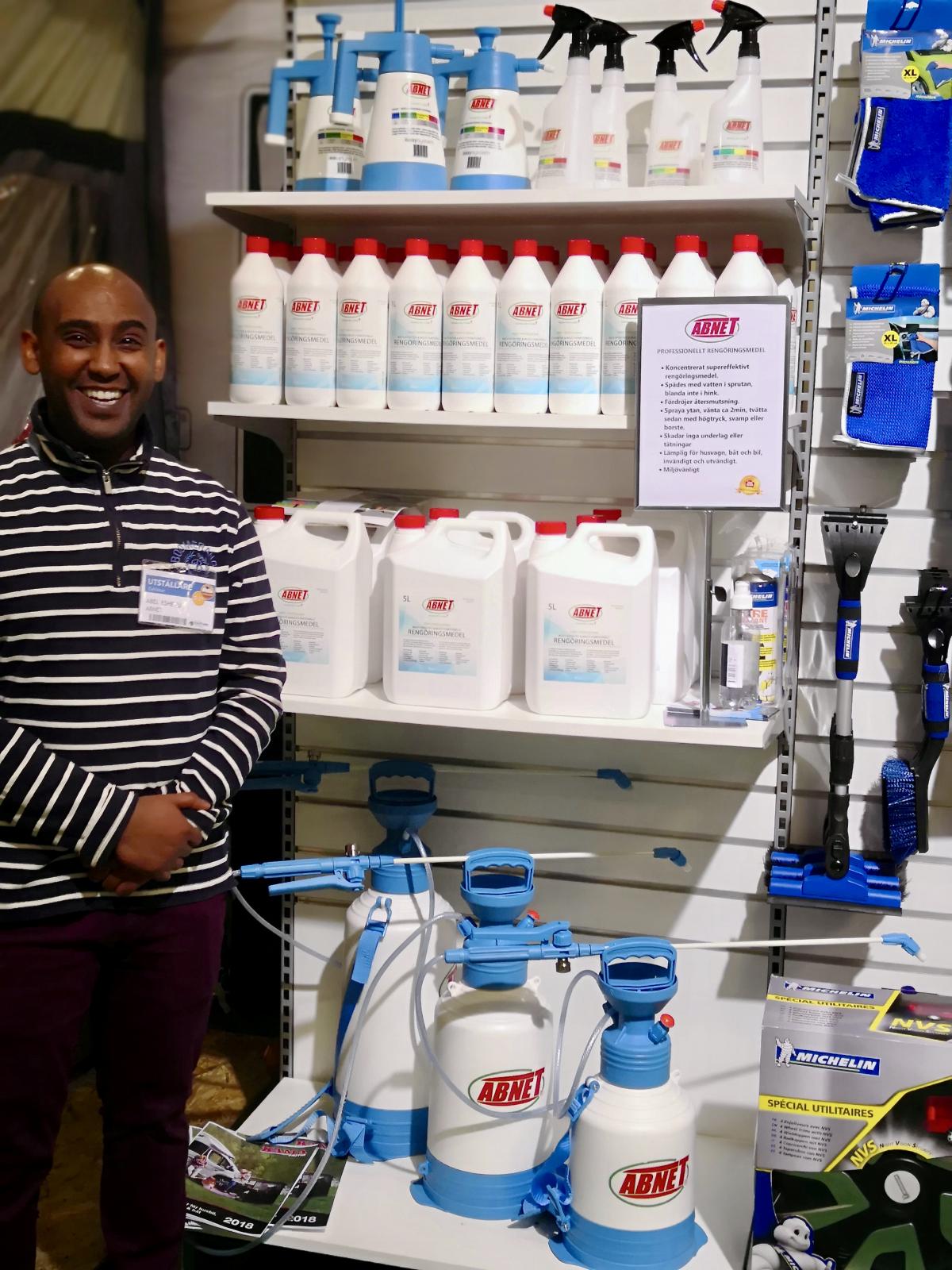 Abel på AbNet stod i KamaFritids monter och demonstrerade rengöringsmedel för husbilar och husvagnar.