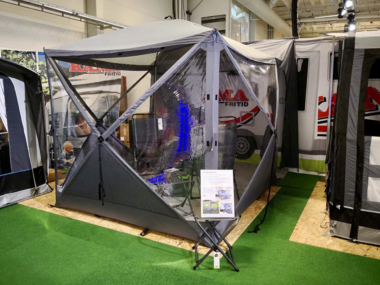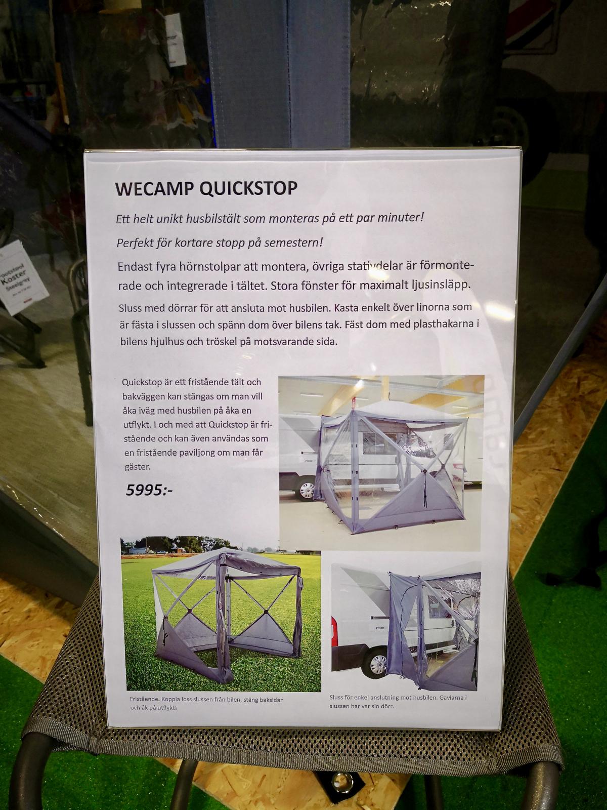 WeCamp Quickstop är en spännande innovation som premiärvisas i Kista. Ett mycket lätt och smidigt förtält med sluss till husbil eller vagn. Passar utmärkt för plåtisar.