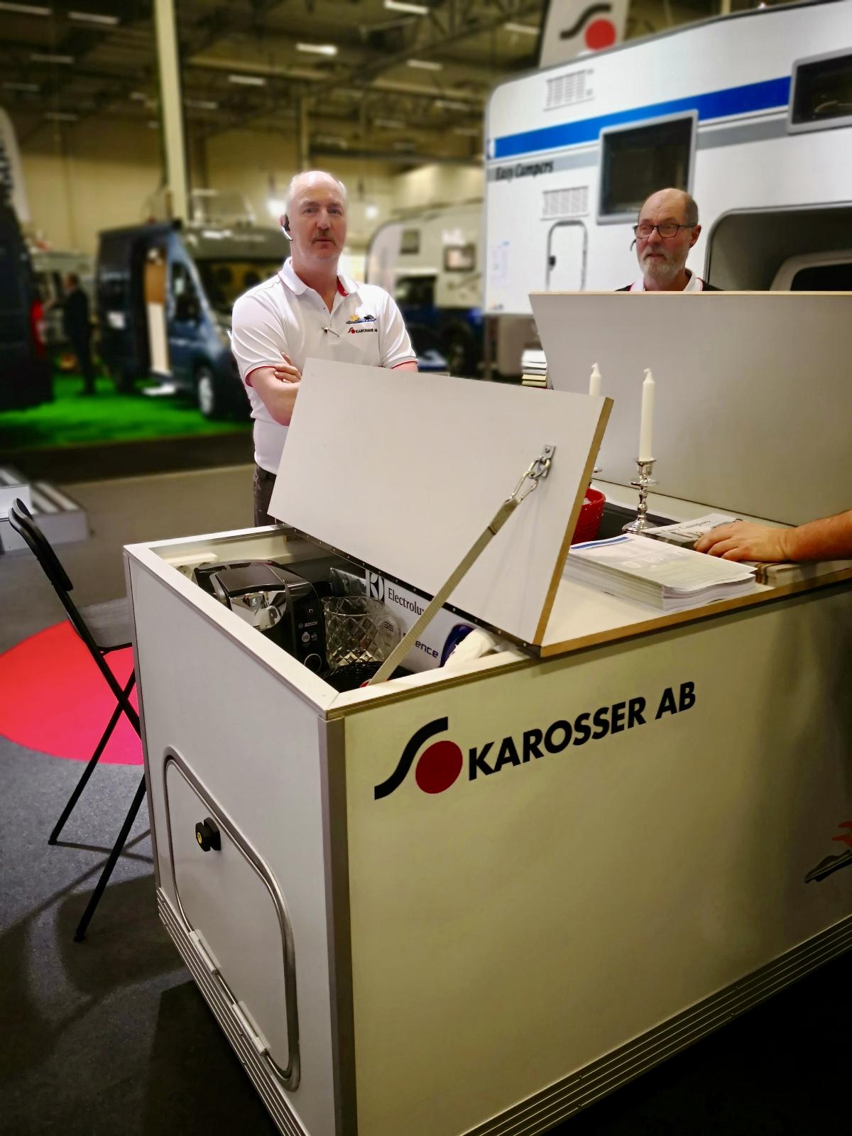 Förutom campers gör S-Karosser många specialbyggen. Till exempel en egen finurlig mässdisk med förvaring och kaffebryggare.