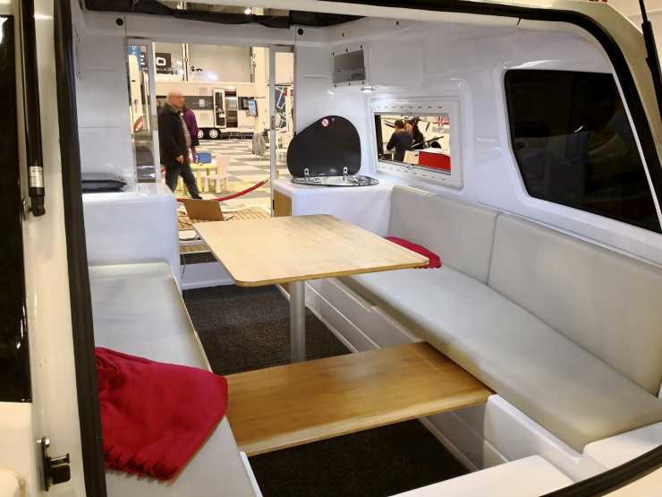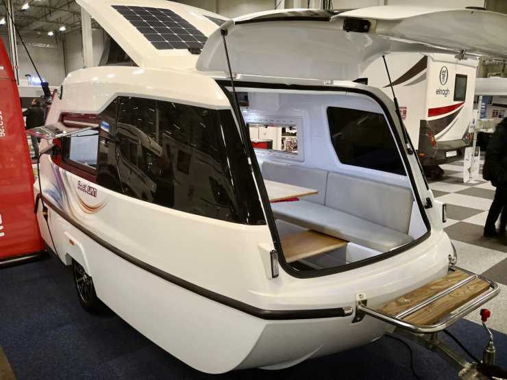 Husvagnen BoatVan är dock inte tänkt för Atlantfärder men väl en stilla tur i sjö och vattendrag. Snygg design och solpaneler på taket.