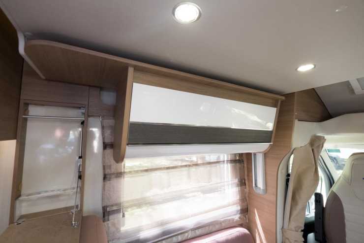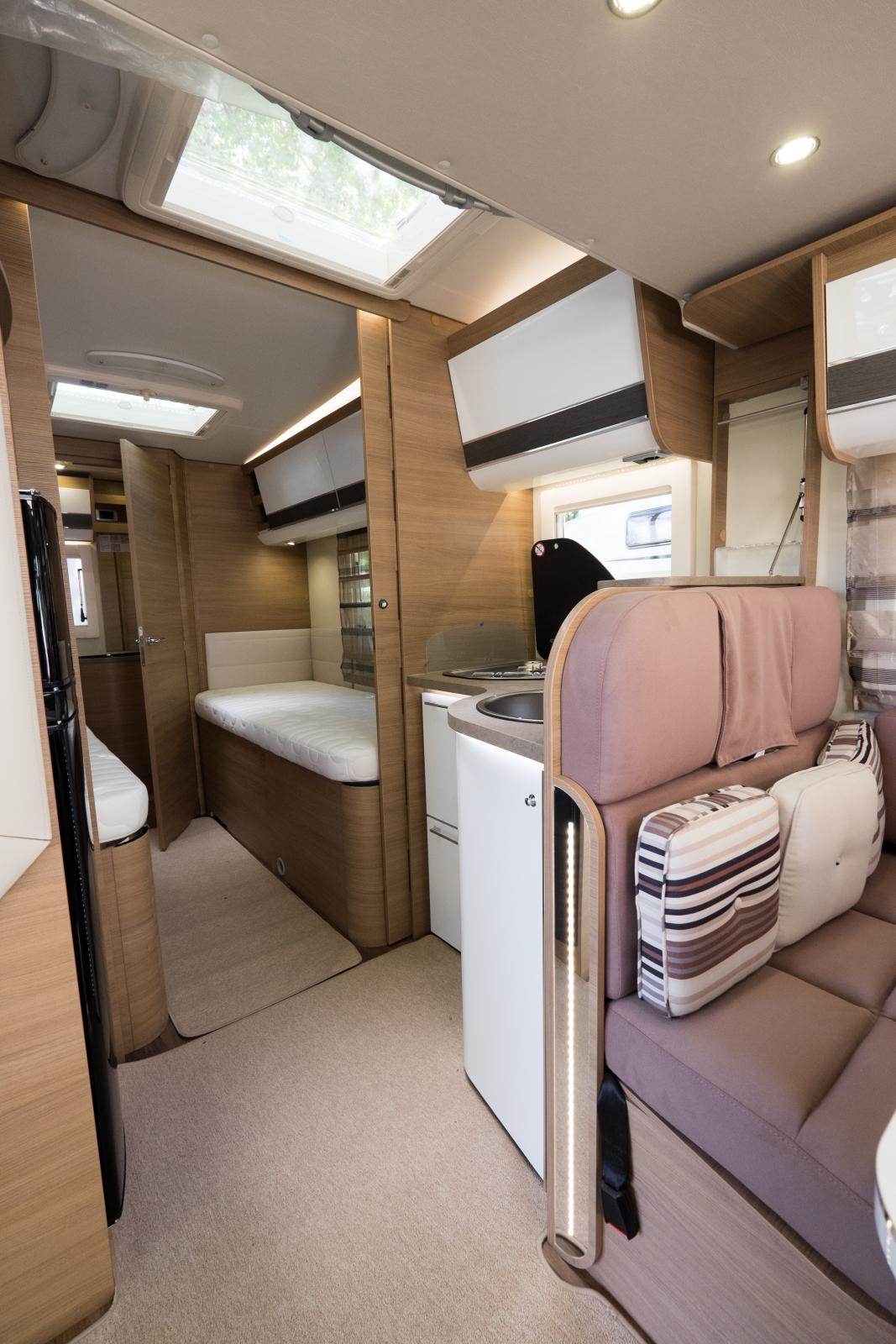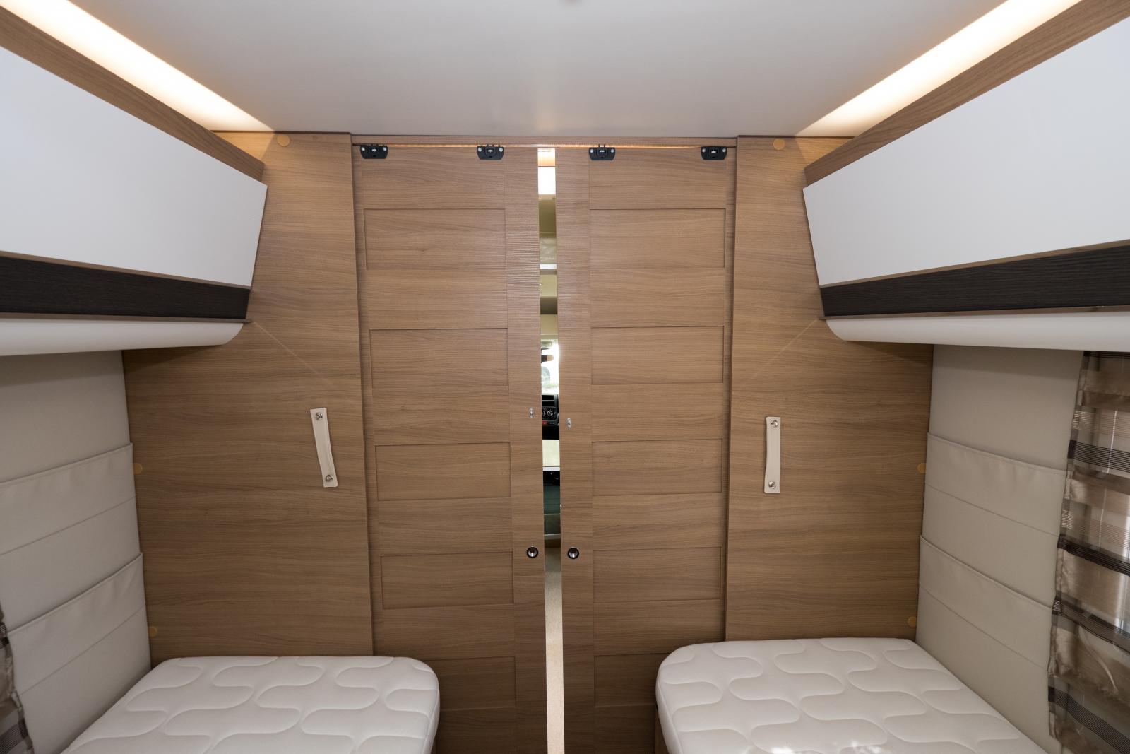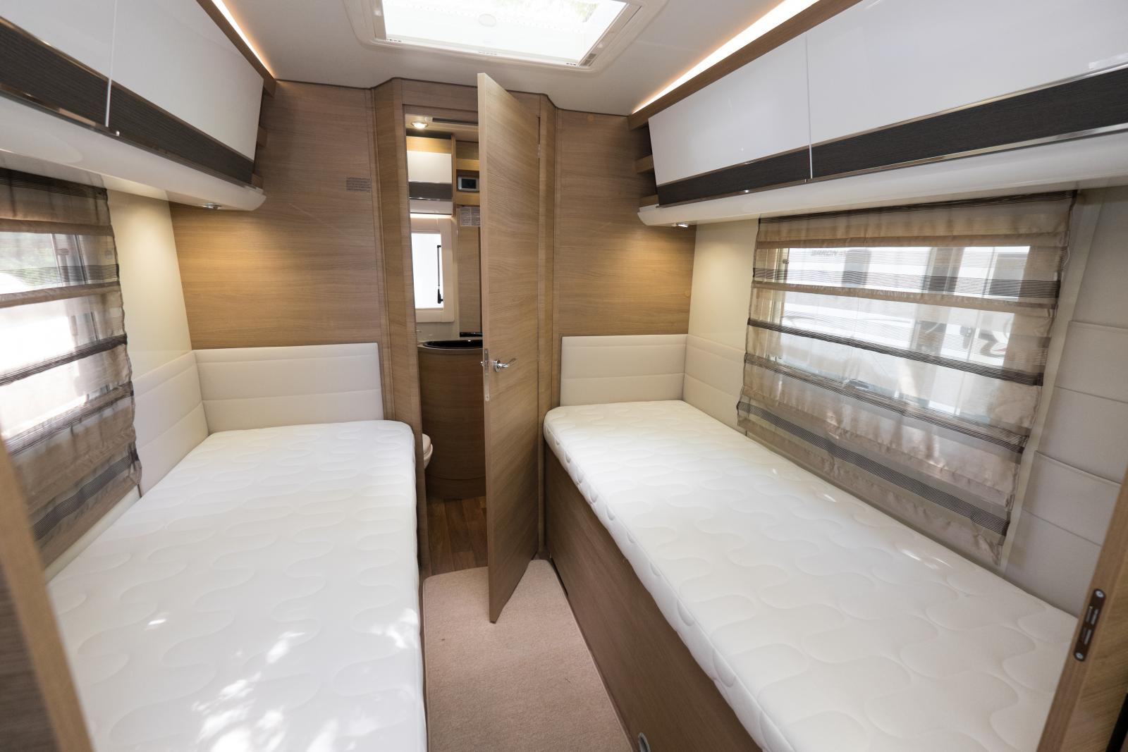 Låga långbäddar med hygienutrymmet längst bak i bilen. Notera de öppna hyllorna längst bort i överskåpen. Bra till böcker när man står stilla.