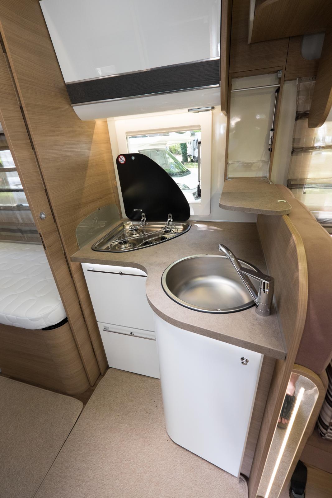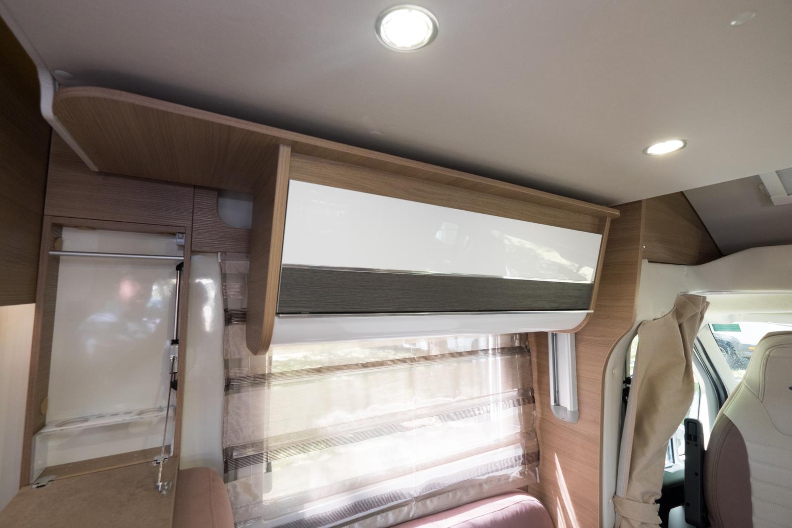 Den nedsänkbara taksängen gör att överskåpet måste göras kortare för att inte slå emot ryggstödet/köksdelen och där har Elnagh satt detta utfällbara hyllplan.