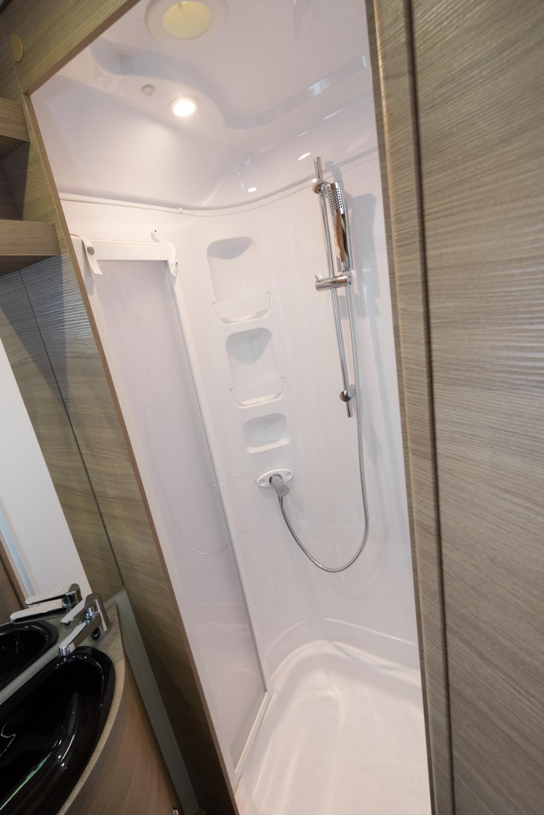 Duschkabin med hyllor och belysning.