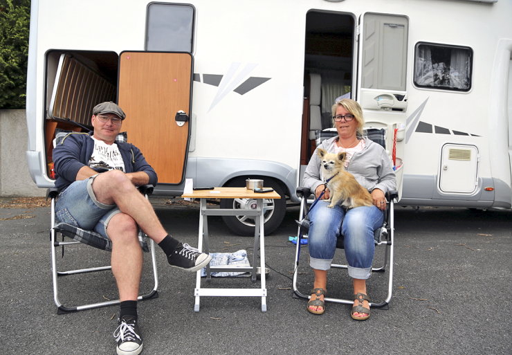 Tommy och Carola Ovesen med hunden Rasmus från Lidköping kör en Giottiline Therry T41. De har rest via Skåne och Hallandskusten norrut till Hyssna där de funderar på bilbyte och därför stannar på Forsbergs bakgård över natten. – Vi tittar efter bilar byggda före 2010 för att slippa den förbannade skatten. När vi kan tjäna 3000 kr/år på att köpa en äldre bil är det något som är fel. Vi vill byta bort den här bilen eftersom barnen inte vill hänga med längre, sen är lastvikten ett skämt. Bilen har sex bältade platser men en lastvikt på 425 kilo så vi fick väl vara glada om det gick att få med sig extrakläder.