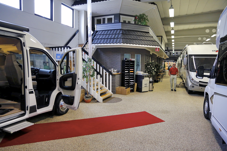 Helikopterplattan på bakgården kan tänkas behövas när presumtiva köpare av landets lyxigaste husbilar hälsar på.