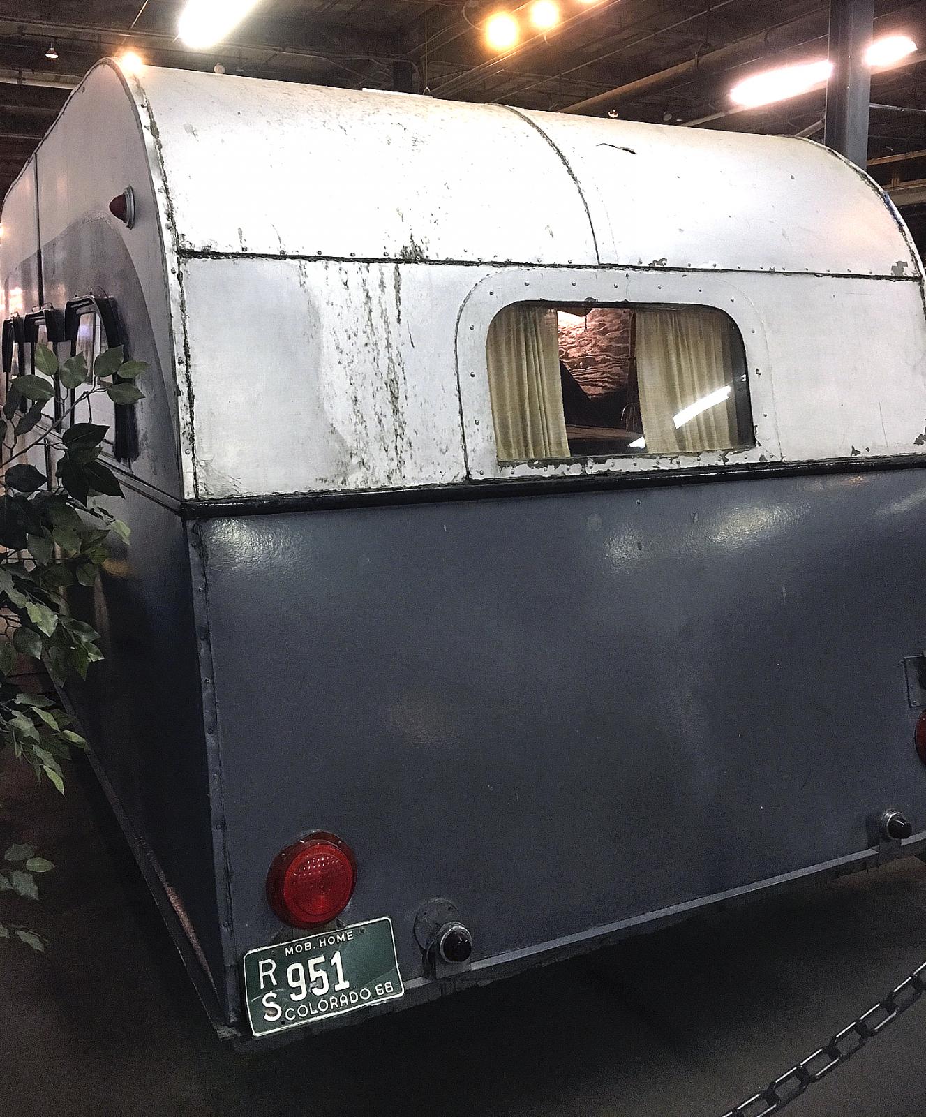 Bakdelen med registreringsskylt som avslöjade att det var ett mobilt hem som rullade längs vägen. Vagnen har rullat i många av USA:s stater men står i dag på ett museum i Denver, Colorado, där vi även hittade...