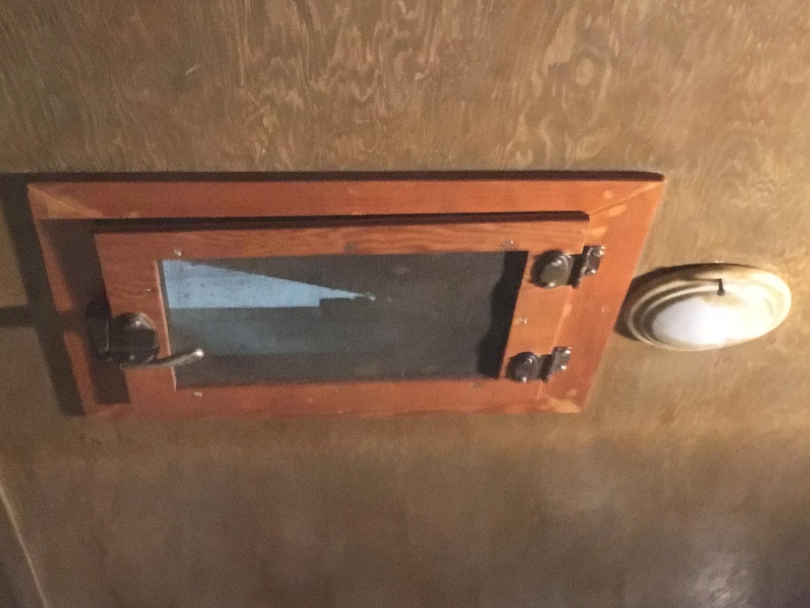 ...sofistikerad taklucka med metallhandtag och gångjärn. Även i taket syns en belysning, knappast LED.