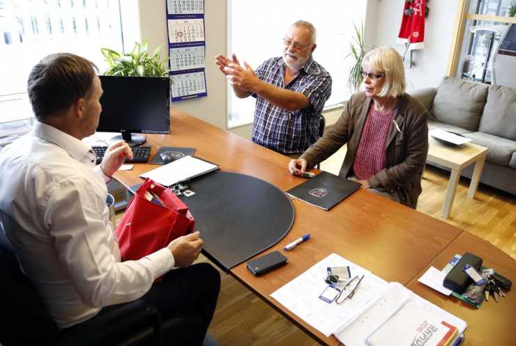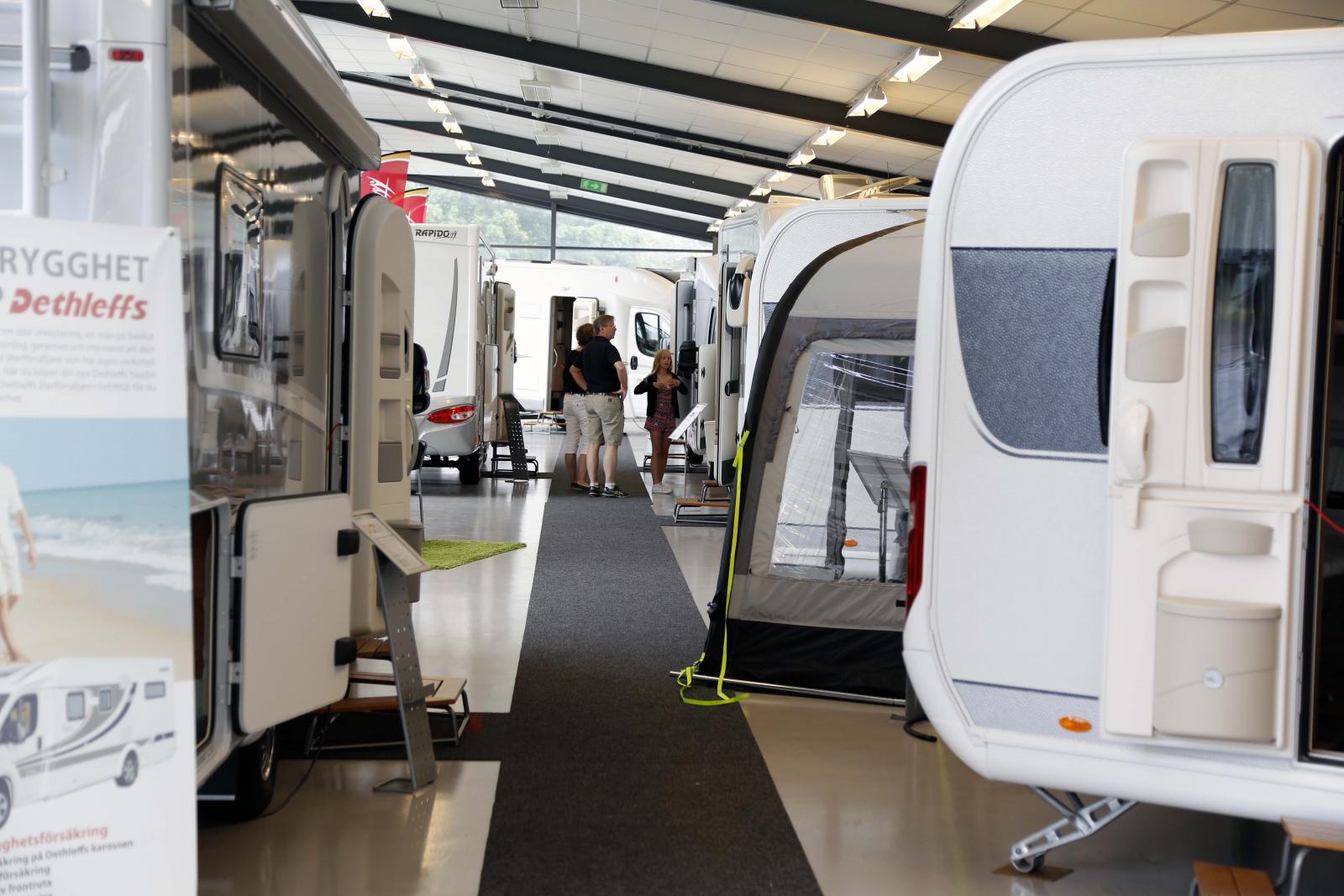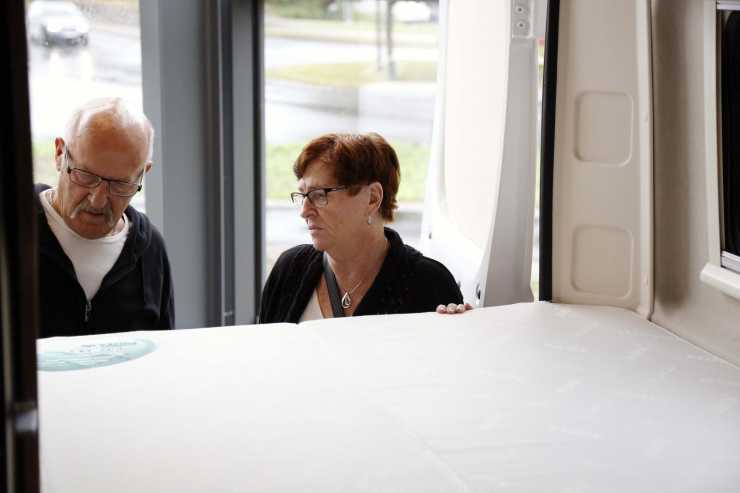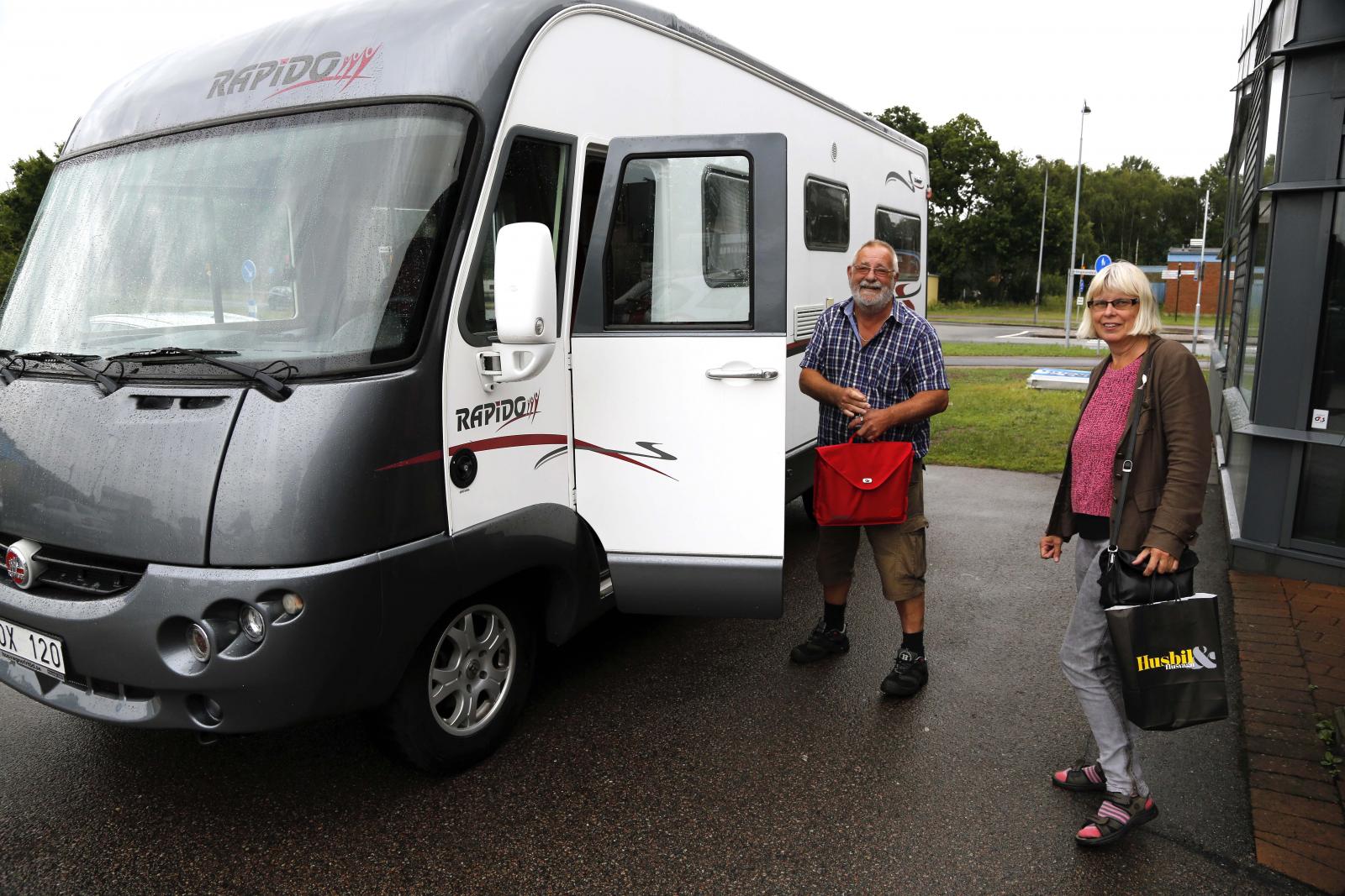 Karl-Johan och Irene Pettersson från Ålem har en Eura som de är nöjda med bortsett från att den har alkovbädd. – När man är i stan för att besikta husbilen får man passa på att titta förbi här. Vi vill ha något som inte är så stort för vi gillar att campa i skogen, säger de.