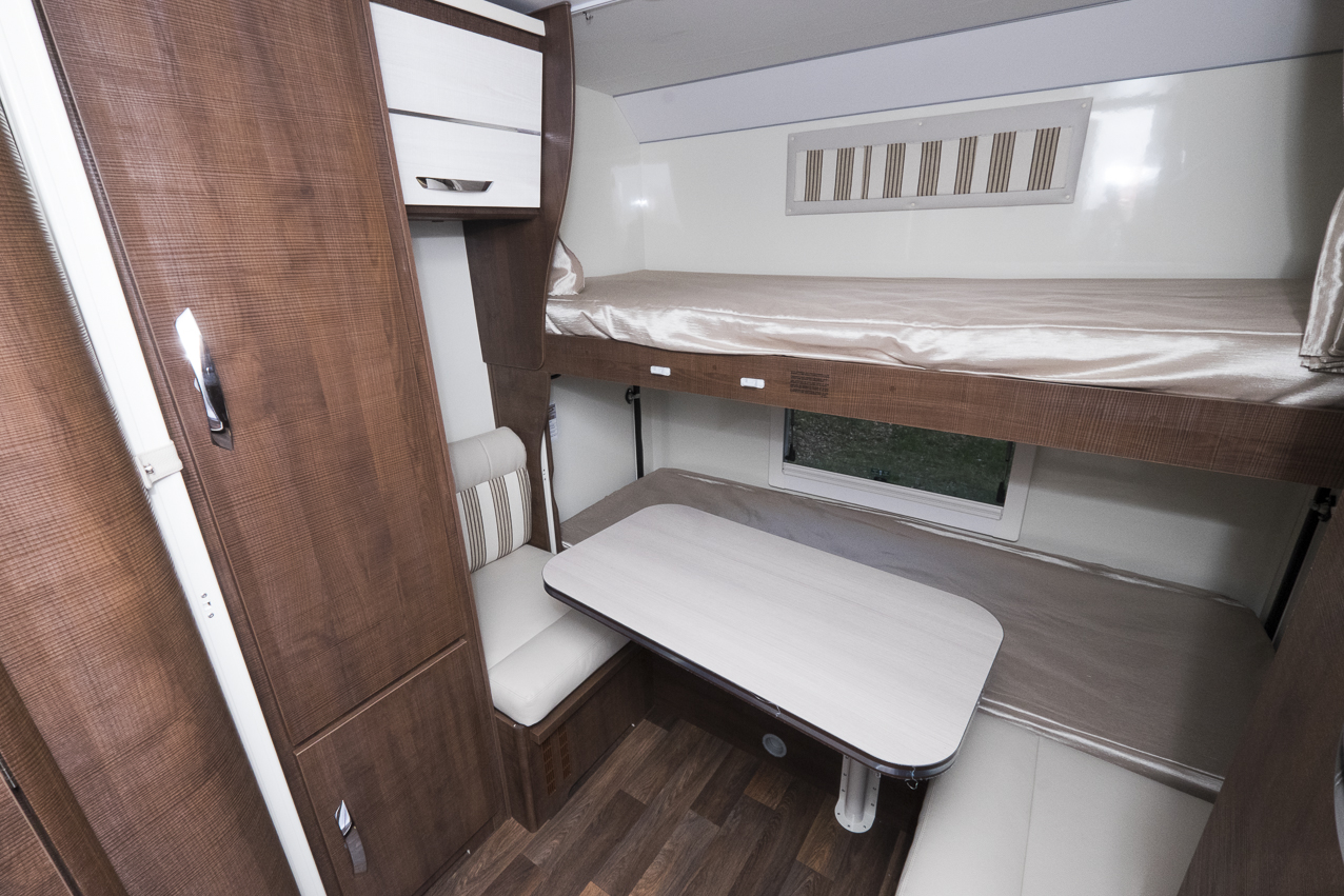 Spännande lösning med våningssäng och egen liten dinett - som dessutom är bäddbar vilket ger en tvärställd dubbelsäng nedtill.