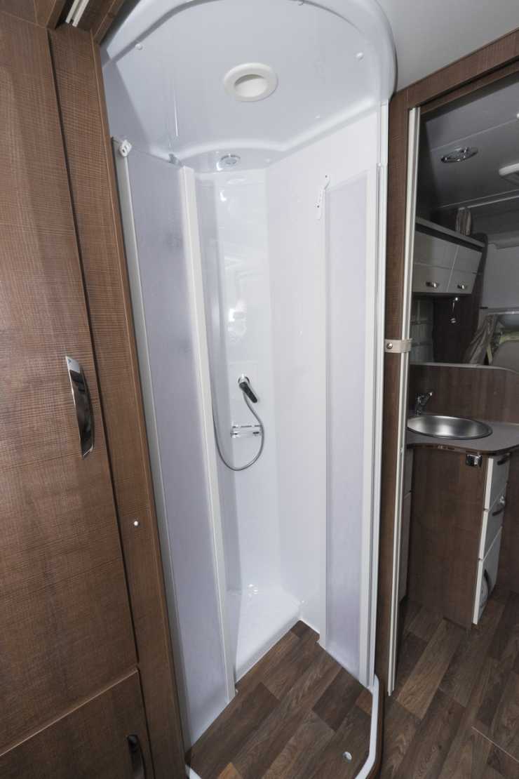 Duschens kar kan täckas för med träinlägg och bildar då en del av golvet.