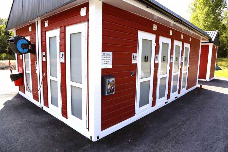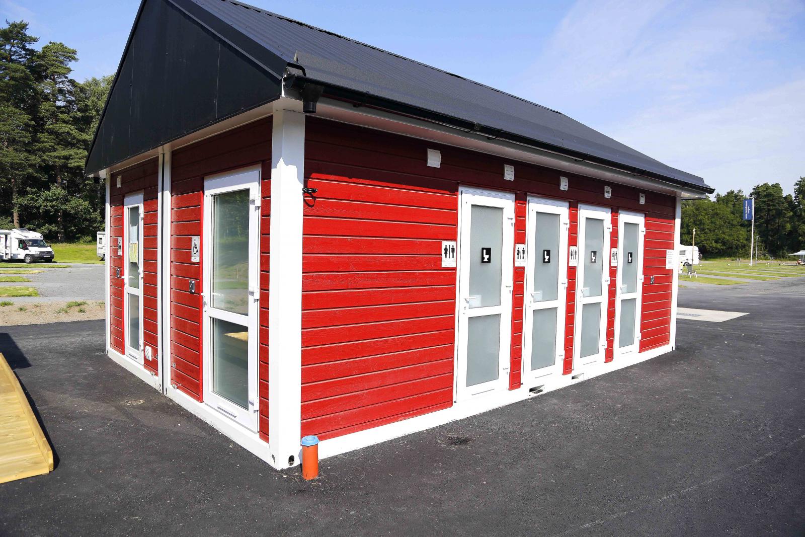 På ena sidan finns toaletterna och andra sidan duschar. Det lilla huset i bakgrunden är en handikappdusch. HKP-toa finns också.