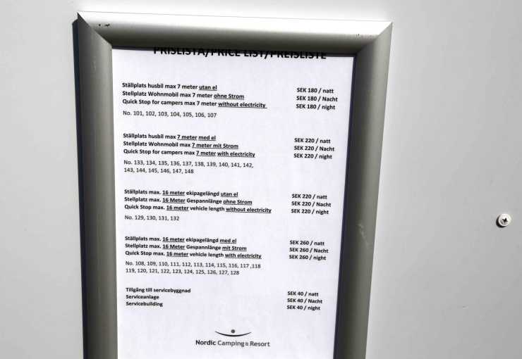 Tillgång till servicehuset med toaletter och duschar kostar 40 kr extra och betalas på campingen i receptionen.