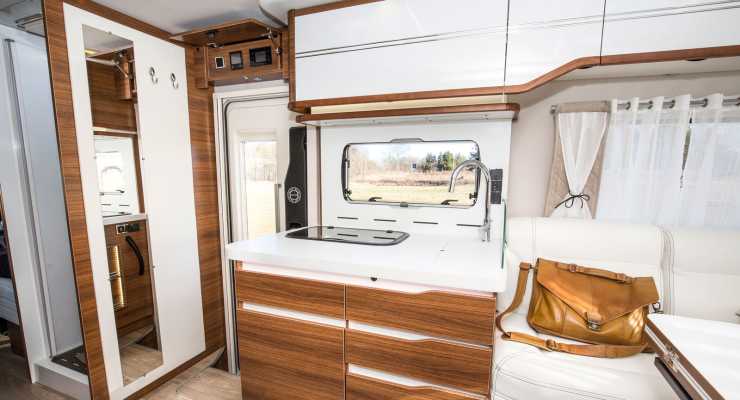 Dörren in till badrummet har magnetisk kolv och kan fästas mot mittgången. Tillsammans med skjutdörren till förarhytt/sovrum kan badrummet således enkelt skärmas av från övriga husbilen.