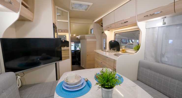 Ovanpå dessa finns en djup och praktisk avsats och ovanför den ett par hyllor som döljs av en lodrätgående jalusidörr. Här finns även ett utdragbart tv-fäste. Under kyl och frys hittar vi en lucka som erbjuder ytterligare förvaring. I köket finns både taklucka och fönster, liksom uttag för 230 volt. Köksfläkt saknas.