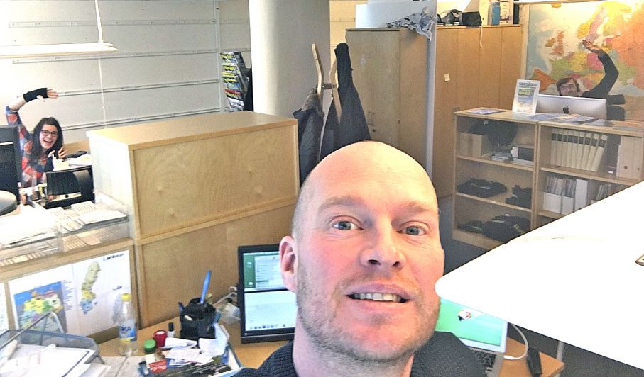 Fredag och åter på redaktionen. Maria och Mattias hälsar i bakgrunden.