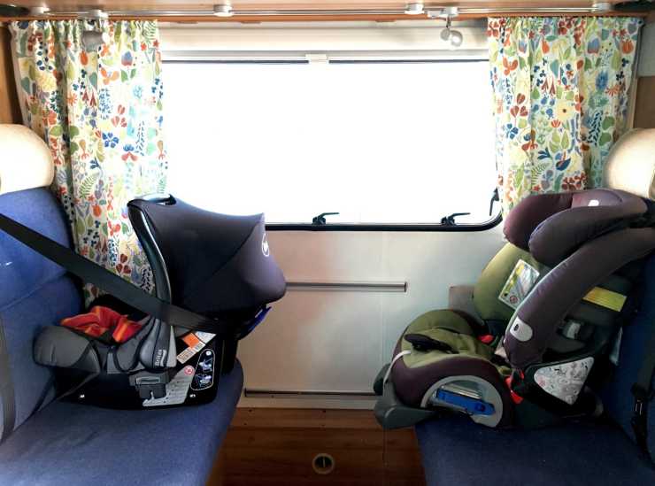 Eftersom det ofta anses svårt att fästa bilbarnstolar i husbilar vill jag tipsa om vår lösning. Så här sitter våra barn, nyfödd respektive 2 år, i vår husbil: