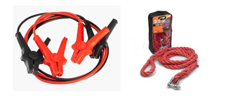 Startkablar av CCA-tråd. Ska vara lätthanterliga även i sträng kyla. 99:90 hos Biltema. Bogserlina från Mekonomen, 206 kr.