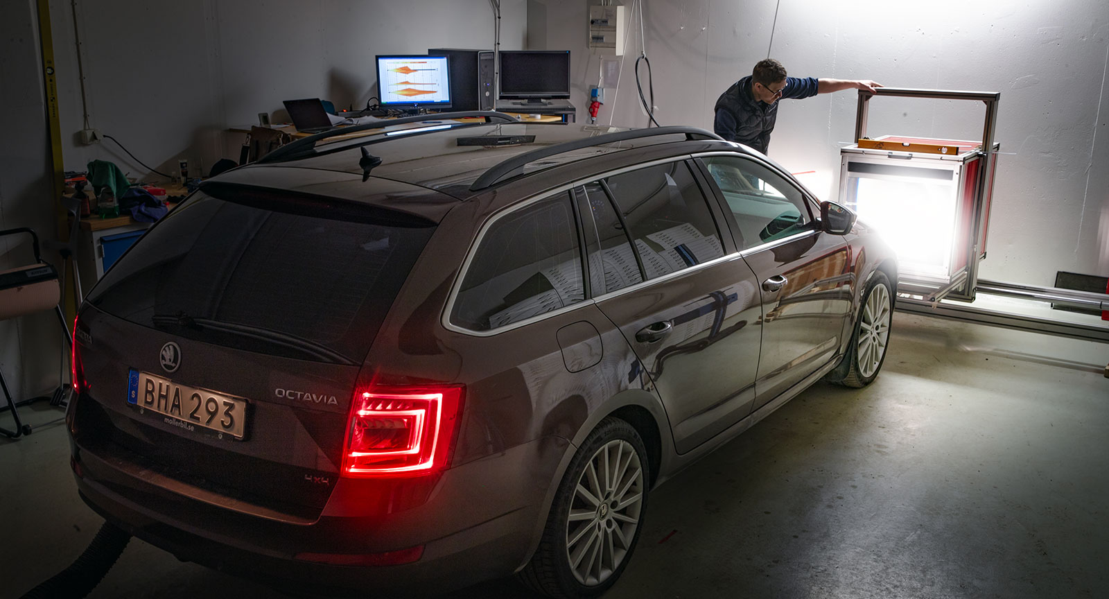 Med LED-lampor lyser Skoda Octavia både längre och bredare. Vi Bilägares unika ljuslabb har för låg takhöjd för husbilar, annars hade vi med stort intresse testat husbilsstrålkastare också!