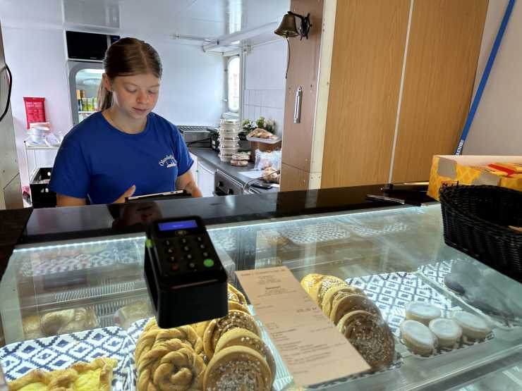 Kafeterian serverar smörgåsar och bakverk.