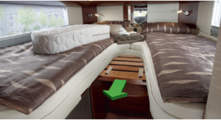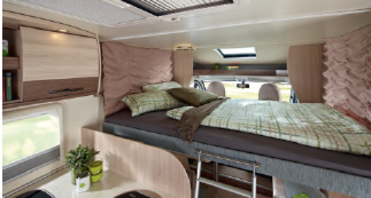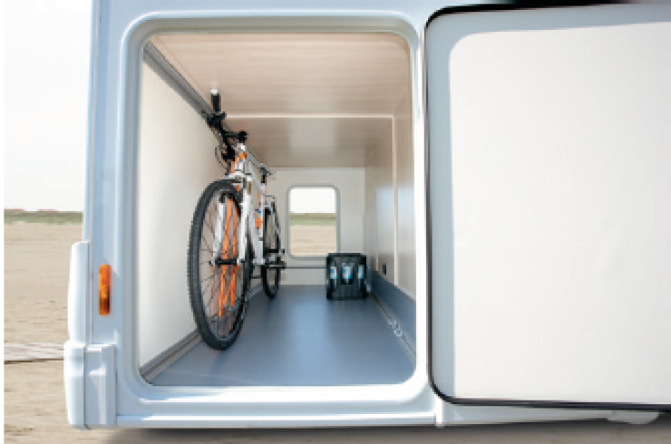 Alkovmodellerna finns i fyra versioner och är tänkt för den som gärna tar en tur med sin mountainbike när resmålet nåtts. Det finns till och med tvättutrustning i garaget som tillval för den som vill vårda sin utrustning på ett enkelt sätt. Takhöjden är här 2,18 meter.
