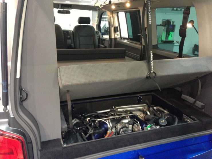 Folkamotorn i fronten har avlägsnats och istället har det ungdomligt sinnade gänget på SpaceCamper stoppat i en Porsche 997 Turbo längst bak under dubbelsängen. Förutom att dubbelsängen säkert både blir uppvärmd och en smula vibrerande ger det förstås hisnande prestanda. Är det möjligen världens snabbaste husbil tro?