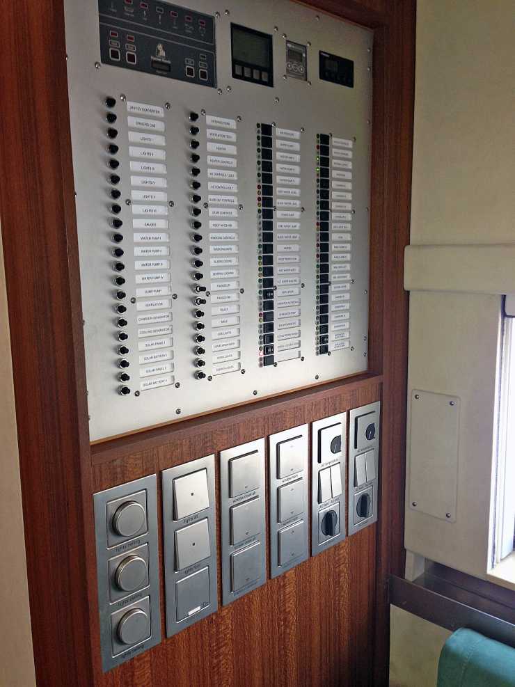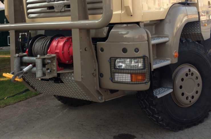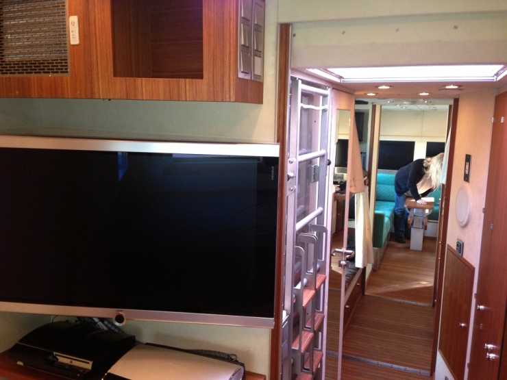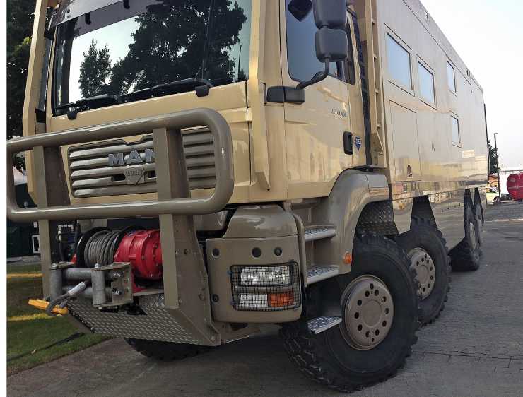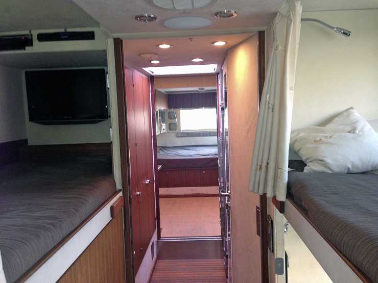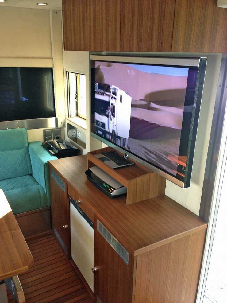 Utrustning: Slide i bak, Satellitmottagning för TV/internet, 7 monitorer varav 4 i full HD, tvättmaskin, hydraulisk trappa, GPS-tracking och så vinsch förstås.