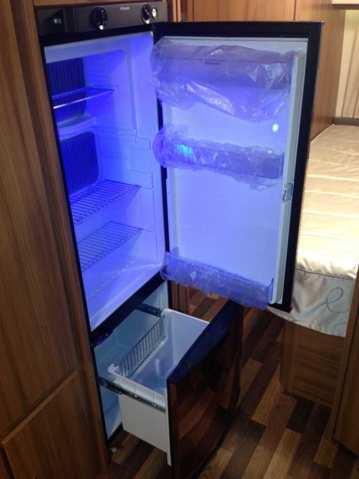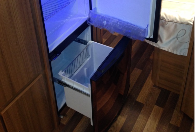 Vi hittade detta absorptionskylskåp från Dometic i en av husvagnarna på mässan i Düsseldorf. Dometic berättar att det nedre utdragbara facket är sammankopplat med övriga kylskåpet. Den utdragbara delen är på 55 liter och passar för kylning av exempelvis läsk- eller ölflaskor. Här kan 12 literflaskor stå för avkylning istället för att ta upp stor plats liggande bland de andra varorna.