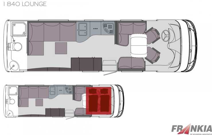 Bilens planlösning är till en början bekant med förarhytt och sittgrupp till höger innanför entrén. Men bakåt i bilen är det är det mer exotiskt. Hela bilen ger ett mycket öppet intryck vilket till stor del beror på att det inte finns några sängar alls. Om det handlade om en kompaktbil vore det kanske inte så märkvärdigt men detta är tveklöst en fullvuxen bil. Det kompletta namnet är Frankia I 840 Lounge och Frankia har den goda smaken att anpassa namnet efter bilens längd. Den är nämligen 840 cm lång, 230 cm bred och 306 cm hög. Totalvikten är 5000 kilo vilket ger en lastvikt på 826 kilo.