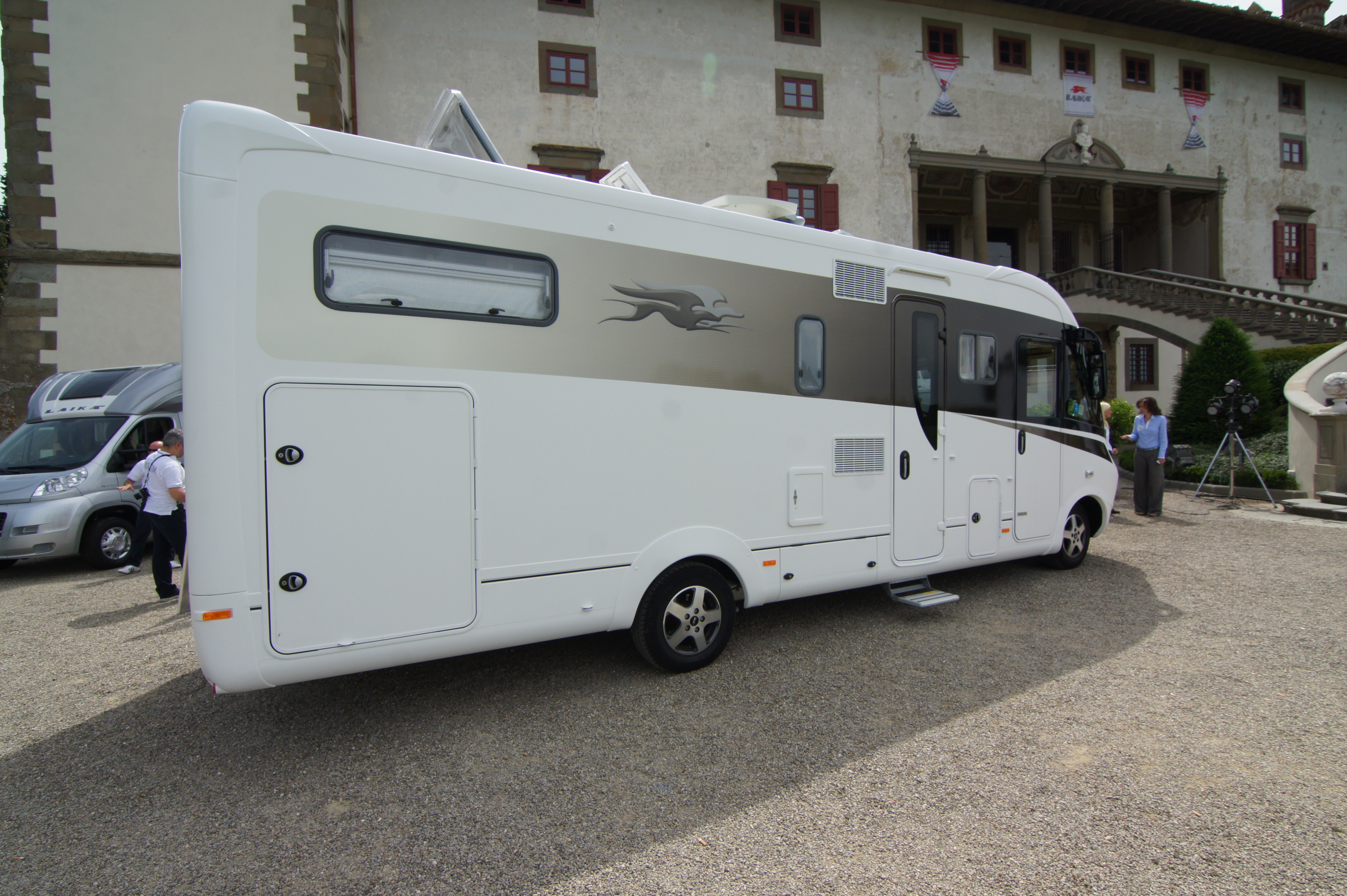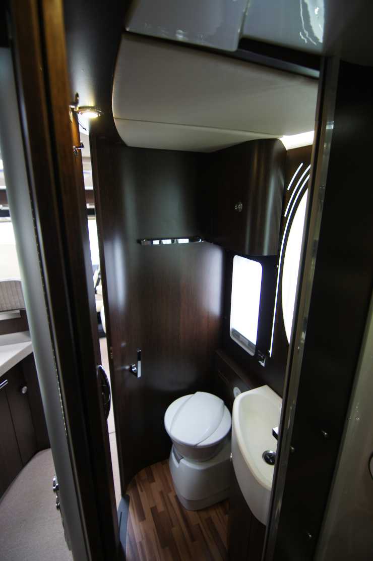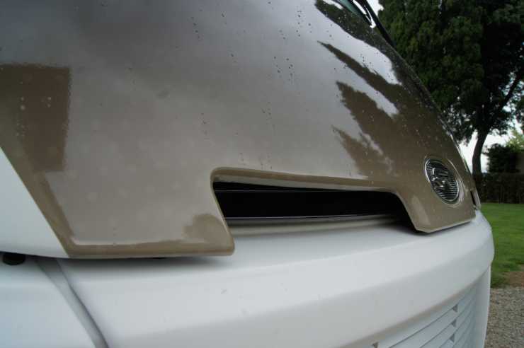 Det nya flaggskeppet påminner om de euopiska snabbtågen. Den utvändiga karossen är läckert matt-vit och dekoren går i svart-brunt. Tittar man noga ser man att färgdekalerna är prickiga. Det är snyggt, smart och nytänkande. Bakljusen ser ut som fyra horisontella streck. En annan fin detalj är att tanklocket sitter placerat i ett eget litet utrymme med lucka, strax utanför förardörren. Jag gillar också att den helintegrerade husbilen har en passagerardörr.