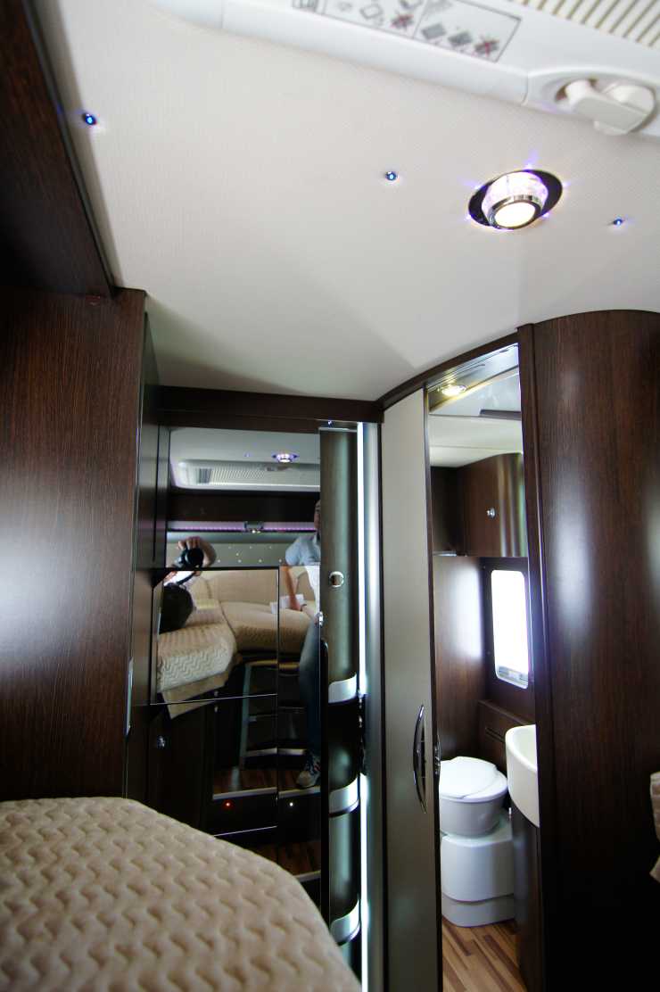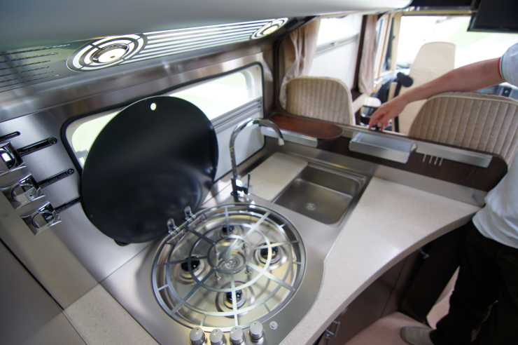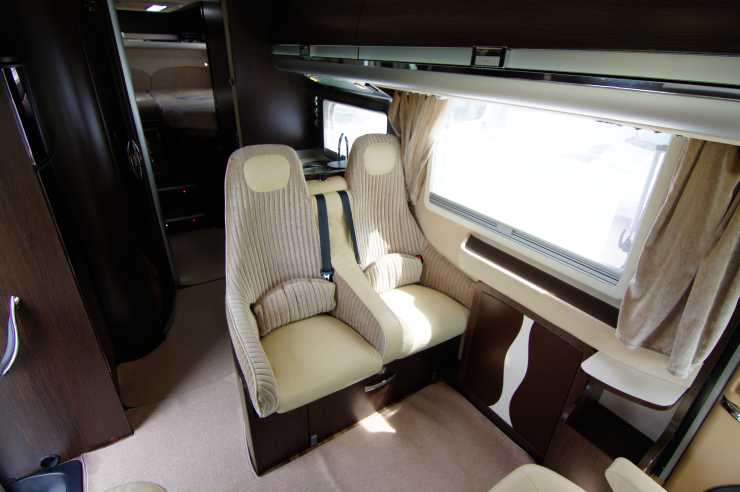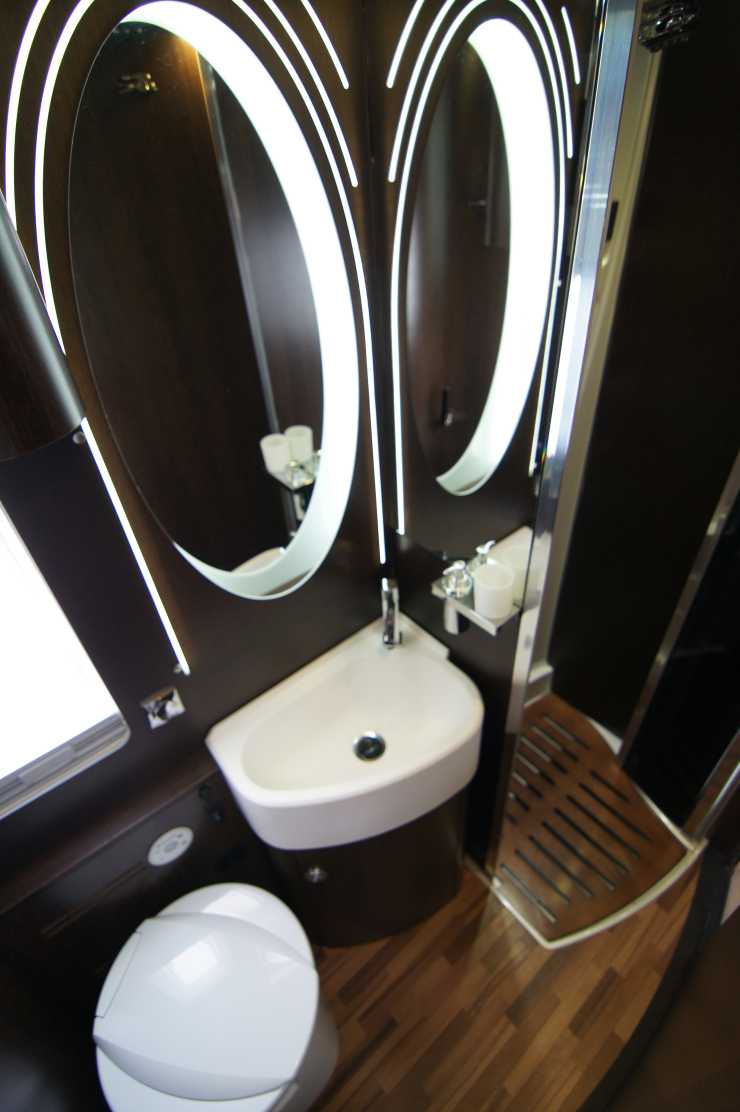 Invändigt finns flera tekniska och designinnovativa lösningar. Passagerarstolarna ser exempelvis ut som sköna biofåtöljer. Under stolarna gömmer sig en utdragbar låda, speciellt framtagen för husdjur. Det är smart, läckert och funktionellt. Andra inredningslösningar som får mig att tänka WOW, är den annorlunda spisen, inspirerad av Leondardo Da Vincis kvadrater i en stor cirkel. Väggarna i köket kläs av rostfritt stål och snickerierna ser ut som träslaget wenge. Badrummet har ett höj- och sänkbart handfat samt en fenomenal dörr som går att öppna från två håll och i en utdragbar spegelvägg gömmer sig en tv.