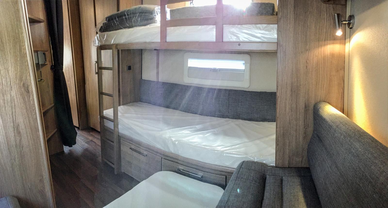 Husbil & Husvagn har varit på en kort roadtrip då vi passade på att titta in hos Fritidcenter.se som har filialer i Göteborg och Trollhättan. Vi valde den senare för där står nämligen en av Kabes nya vagnar i Classicserien: 780 DGDL. Det är en rejält tilltagen tvåaxlad barnkammarvagn som längst bak har en stor barnkammare med egen L-soffa, toaletten och även duschen finns här. Mitt i vagnen finns en dubbelsäng för de vuxna och även många garderober. Längst fram finns i vanlig ordning en väl tilltagen rundsittgrupp som även kan bäddas upp till en stor säng.
