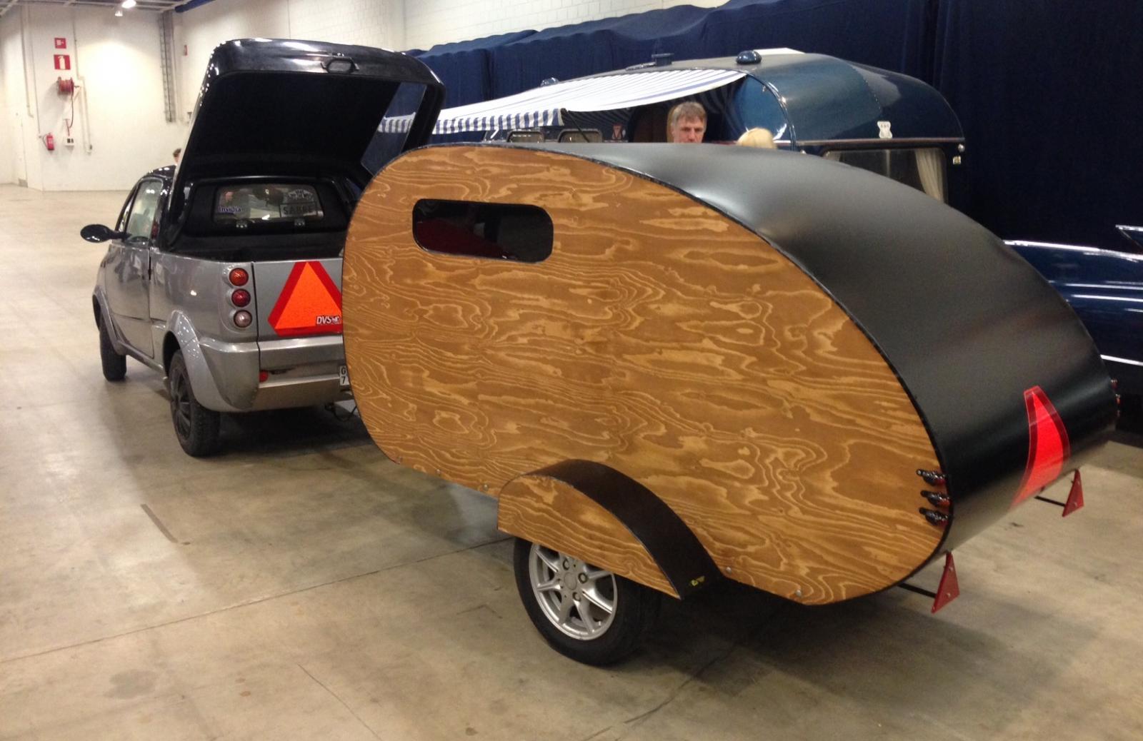Mässan i Helsingfors har nyss avslutats. Här är ett trevligt campingekipage för 15-åringar. En mopedbil med hembyggd och droppformad husvagn. På pick-up-flaket finns plats för packning och en rejäl baslåda för sommarens disco i skogen.