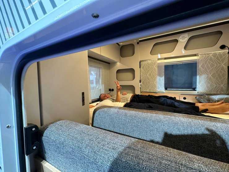 Tittut! Några besökare testar den nedfällbara sängen i Knaus elbilsanpassade vagn Yaseo.