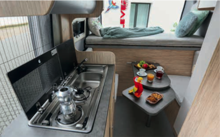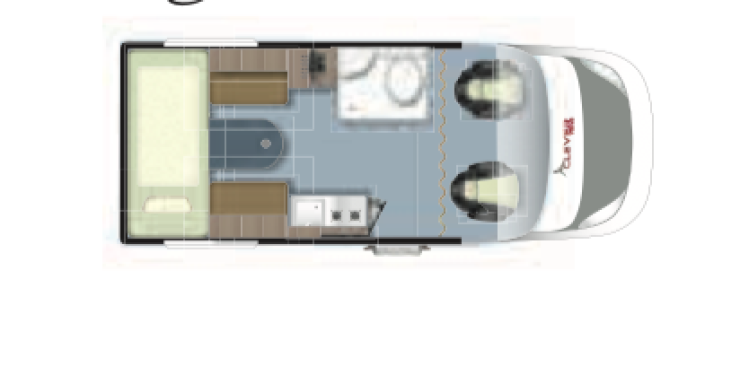 Med den planlösningen blir inte, som vanligtvis, framstolarna en del av sittgruppen och trots att bilen bara är 540 centimeter lång kan den stoltsera med en av de bredare sängarna i en plåtis. Lösningen heter att den är möjlig att dra ut. Sängen har en ribbotten där ribborna ligger så att de går att skjuta ihop vilket gör att man kan få sängen dubbelt så bred och madrasserna läggs när den är hopskjuten ovanpå varandra. När sängen dras ut blir det dock inte möjligt att utnyttja sittgruppen som normalt har plats för två personer som sitter mittemot varandra med ett bord emellan. Under soffornas dynor finns förvaringsutrymmen även om en del av det på förarsidan tas i anspråk för värmepannan. Ovanför respektive soffa finns ett litet rektangulärt fönster och ovanför det överskåp. Förarstolen har ryggen mot badrumsväggen och får på så sätt en inbyggnad och bakåt i bilen, innan sittgruppen finns även en garderob med hängmöjlighet. Det finns även en möjlighet att skärma av passagerarsidan med ett draperi.