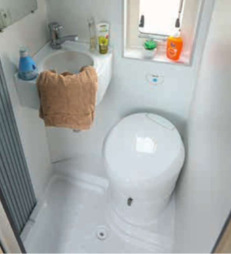 När man kommer in hittar man badrummet tvärsöver och till vänster finns köket. Badrummet har en Thetfordtoalett och det hörnhängda handfatet har en utdragbar kran som även tjänar som dusch, har man valt till badrumsfönster kan man tack vare lång slang dra ut kranen och duscha utomhus. För att stänga om sig finns en skjutbar lamelldörr men vill man ha fönster i badrummet blir det som tillval. Kompressorylskåpet på 70 liter med ett litet frysfack har den dubbelhängda dörren i färdriktningen och är placerat direkt till vänster vid entrédörren och det blir då lätt att nå innehållet både från in- respektive utsidan. Den tvålågiga spisen och hon döljs under glaslock men några större avställningsytor finns det inte plats för. Under spisen finns kylskåpet och under hon en låda och längst ner ett skåp med plats för gasolflaskan. Överskåpet är rymligt men saknar dock hyllor och färskvattentanken rymmer 60 liter, gråvattentanken 50.