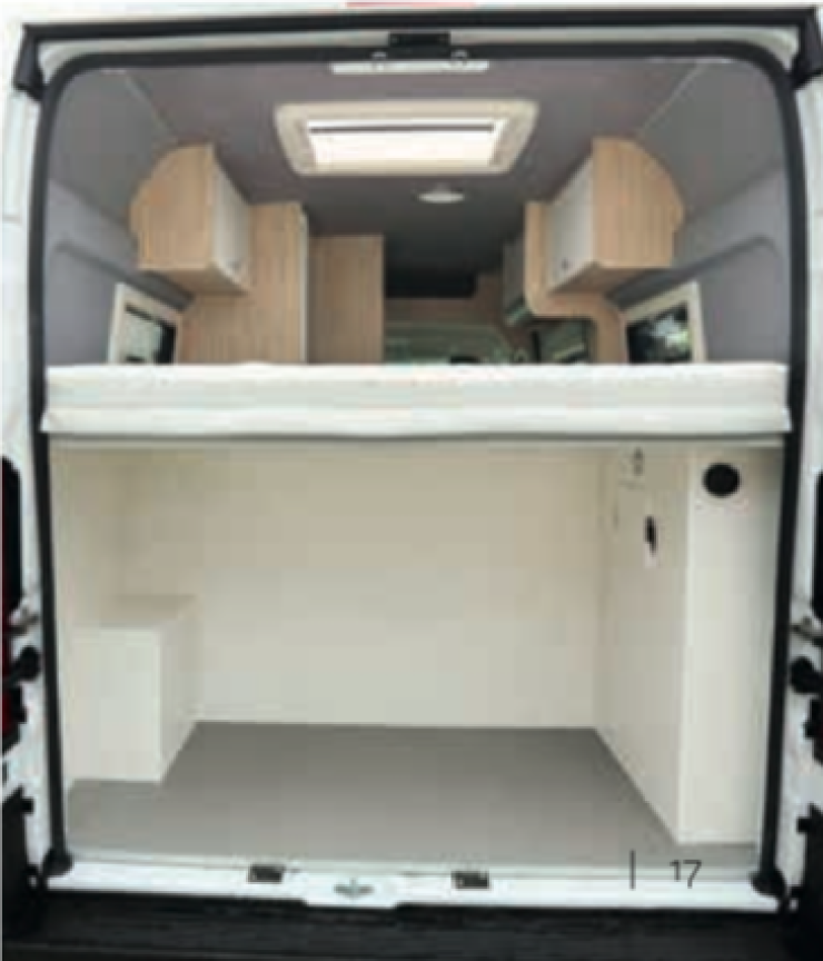 Under sängen i bak och nåbart via de dubbla bakdörrarna finns ett rejält förvaringsutrymme, stort nog för en cykel.