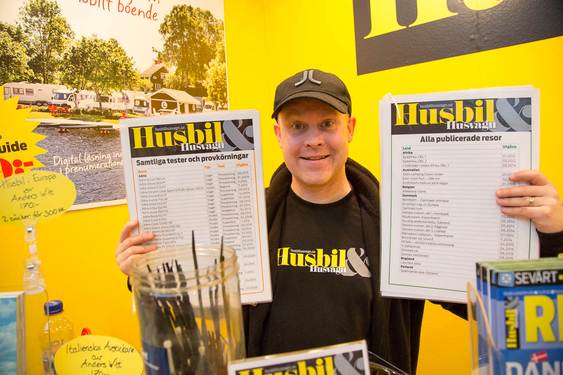 Vår testchef, Mikael Galvér, poserar stolt med listorna över både tester och resmål vi publicerat eftersom du kan köpa äldre nummer av tidningarna i vår monter!