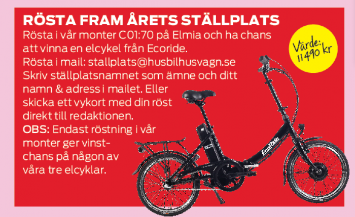 Det kommer dock fler möjligheter att vinna. För dig som är på mässan och röstar på "årets ställplats" lottar vi ut tre stycken elcyklar från Ecoride. Rösta i vår monter C01:70 och var med i utlottningen du också!