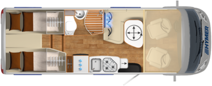Bodelen har helt plant golv ända från förarplatsen och den stora vindrutan ger både bra sikt och ljus i bilen. Väggarna har Hymers patenterade PUAL konstruktion vilken har god isolerande förmåga.