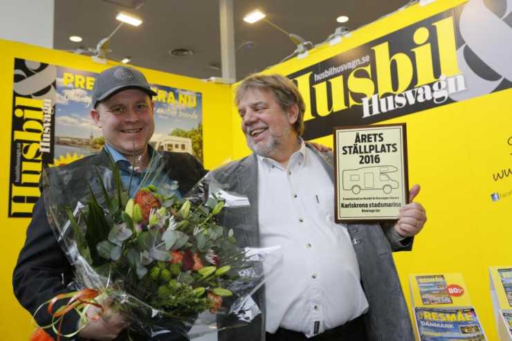 Det var glada miner när Klas Hjärtstam från Karlskrona Stadsmarina tog emot priset för Årets Ställplats 2016 av vår chefredaktör Mikael Galvér.