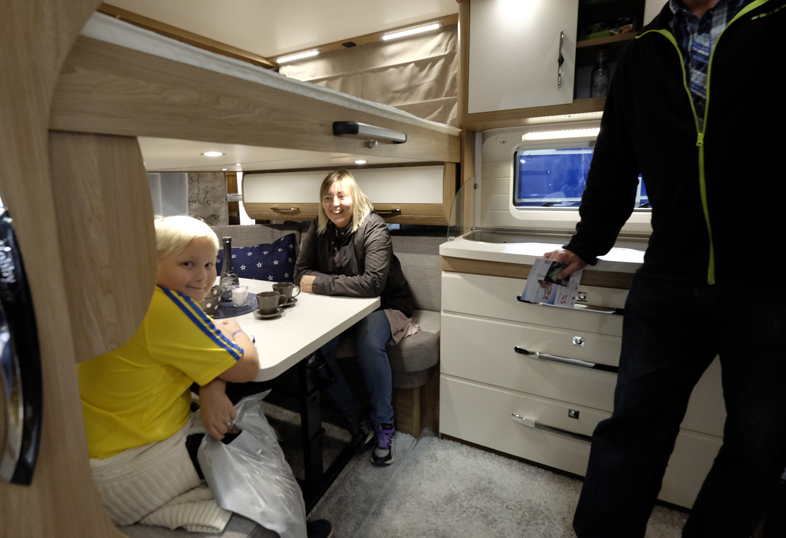 Vagnen har ett välutrustat kök, stor sittgrupp längst bak och ett badrum med dusch. Det finns också gott om förvaringsutrymmen. Och det som gör vagnen något utöver det vanliga är att det finns sammanlagt sju bäddplatser.