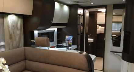 Bädden ovanför alkoven är traditionell medan dubbelsängen bak är låg och enorm. Kaffemaskin i kök och enligt lyxalkovtradition en liten lucka ned till förarhytten.