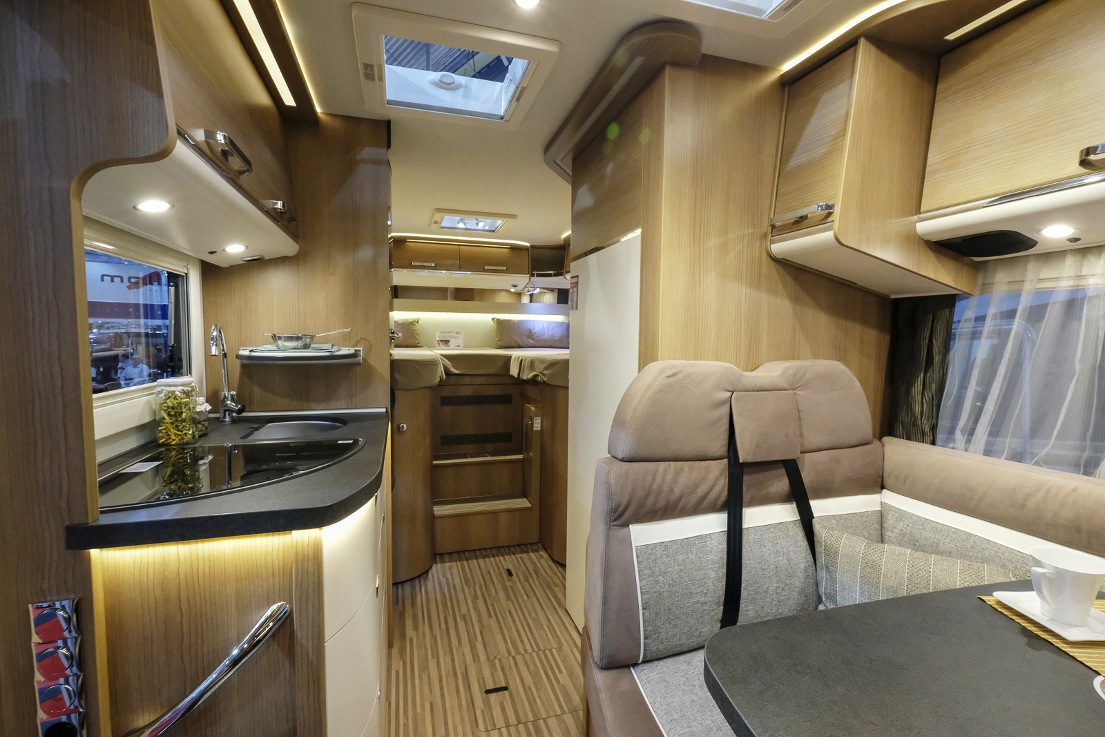 Det finns ett väl tilltaget dubbelgolv som kan nås både utifrån och inifrån bilen vilket ger bra stuvningsalternativ. Sittgruppen rymmer fyra-fem personer och normalt sätt brukar det finnas en nedfällbar säng längst fram. I just detta exemplar finns inte det vilket gör att bilen verkligen känns rymlig, dessutom finns överskåp längst fram vilket ger ”linerkänsla”.