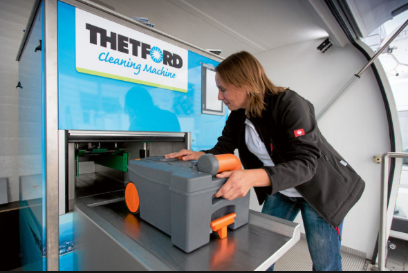 Demonstrationsexemplaret på Elmia Husvagn Husbil är Thetfords tolfte tillverkade maskin. Sedan förra året finns elva maskiner utplacerade på campingplatser runt om i Nederländerna. Thetford äger och servar själva sina maskiner, och av de runt tre euro som en tömningstvätt kostar får campingägaren också en liten peng.