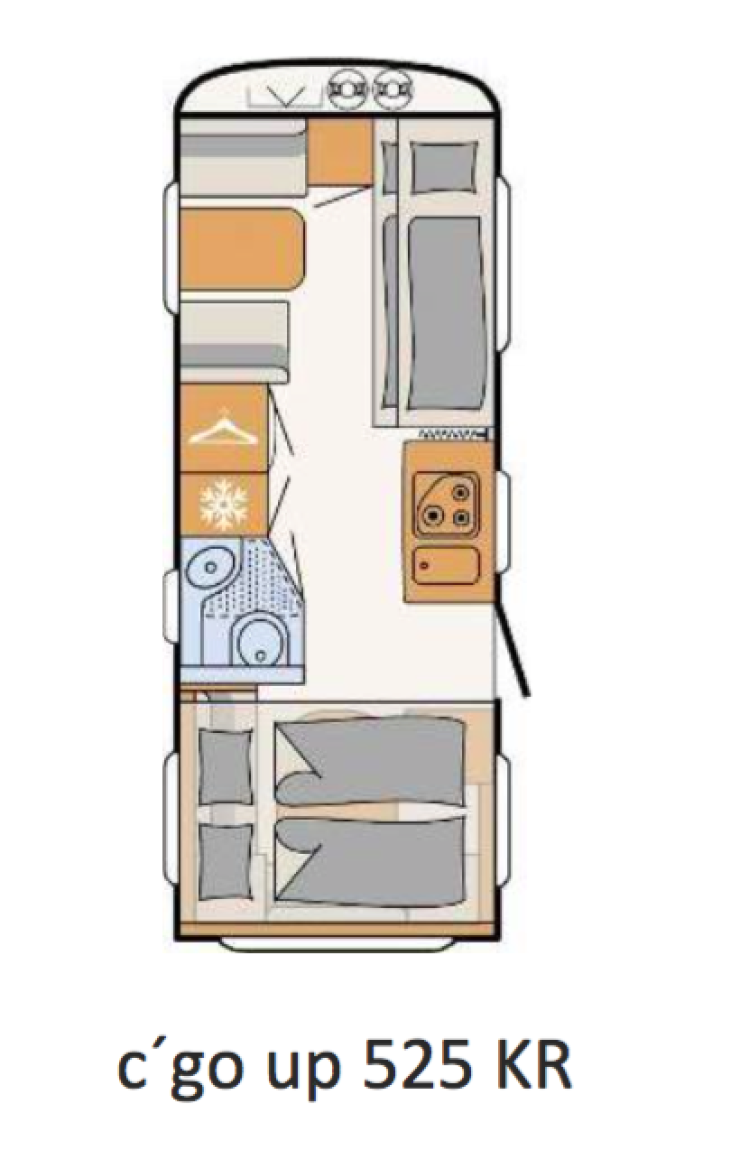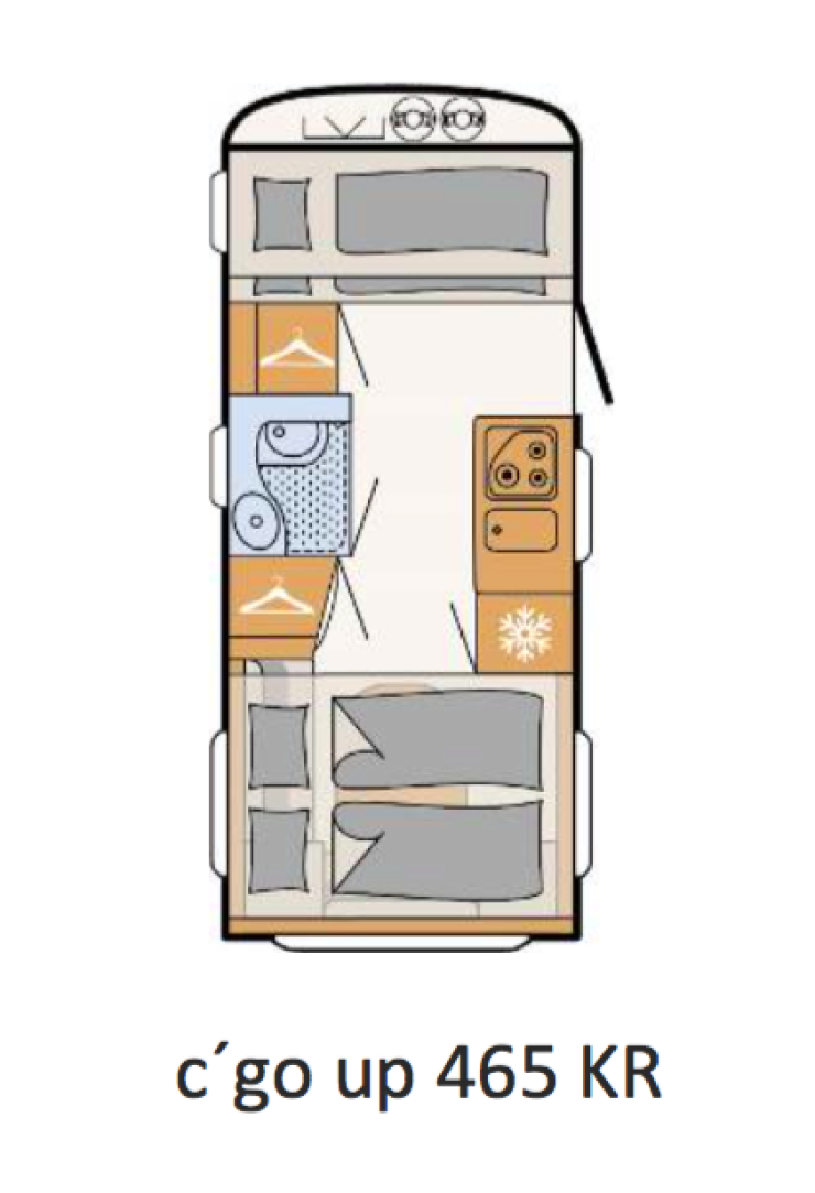 Det går att välja mellan två planlösningar med nedsänkbar säng. Den mindre c ́go up 465 KR har en totallängd på 683 centimeter, erbjuder fyra fasta bäddar och möjligheten att vid behov konvertera sittgruppen under den nedsänkbara sängen till en dubbelsäng. De båda våningssängarna på tvären i fronten tål upp till 80 kilos belastning och har en längd på 210 centimeter vilket gör att även vuxna kan sova i dem. Också i den nedsänkbara sängen med måtten 200 x 145 cm finns mycket rörelsefrihet.